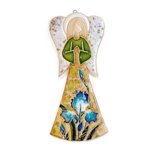Aniołek ceramiczny większy z irysami. Turkusowe irysy na sukience - do powieszania. Dosyć duży - 27 cm. W całości autorska i ręcznie wykonana praca. Ceramika częściowo szkliwiona różnymi kolorami. Aniołek do zawieszenia na ścianie. Posiada haczyk lub pętelkę ze sznurka do zawieszania.