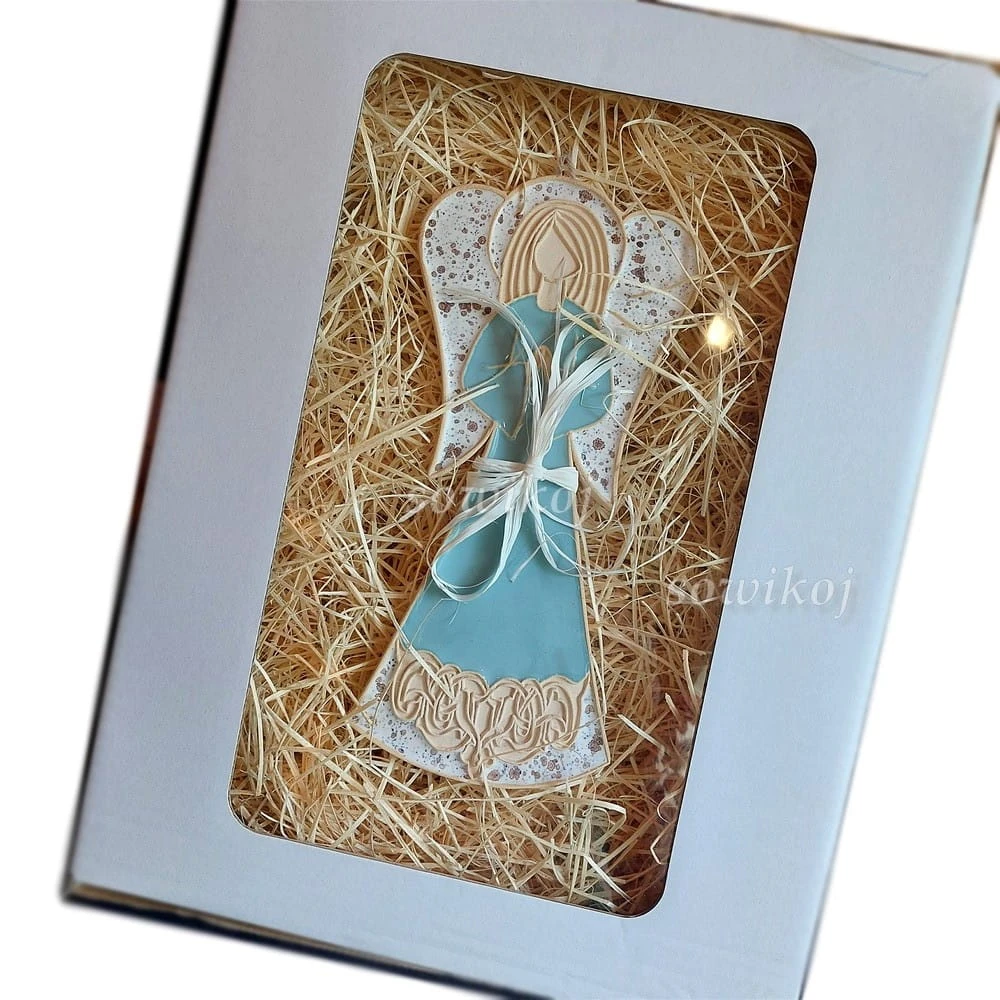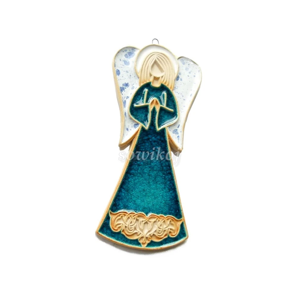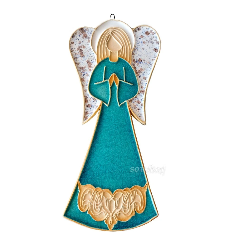 Anioł ceramiczny szkliwiony w kolorze turkusowym - do powieszania duży z reliefem. W całości autorska i ręcznie wykonana praca. Aniołek do zawieszenia na ścianie. Posiada haczyk lub pętelkę ze sznurka do zawieszania.