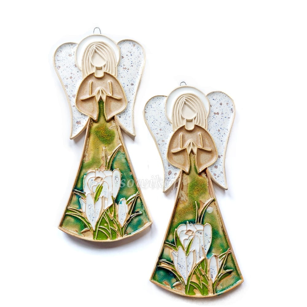 Duże ceramiczne anioły. W całości autorska i ręcznie wykonana praca. Ceramika. Duży anioł - 27 cm, zawieszka. Z pięknym ornamentem kwiatowym na sukience. Białe krokusy.