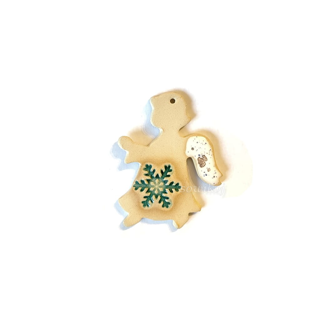 Aniołek ceramiczny- ręcznie robiony wisiorek / zawieszka. Szkliwione skrzydło w kolorze białej stokrotki oraz turkusowa śnieżynka. W całości autorska i ręcznie wykonana praca. Ozdoba świąteczna np. jako zawieszka na choinkę.