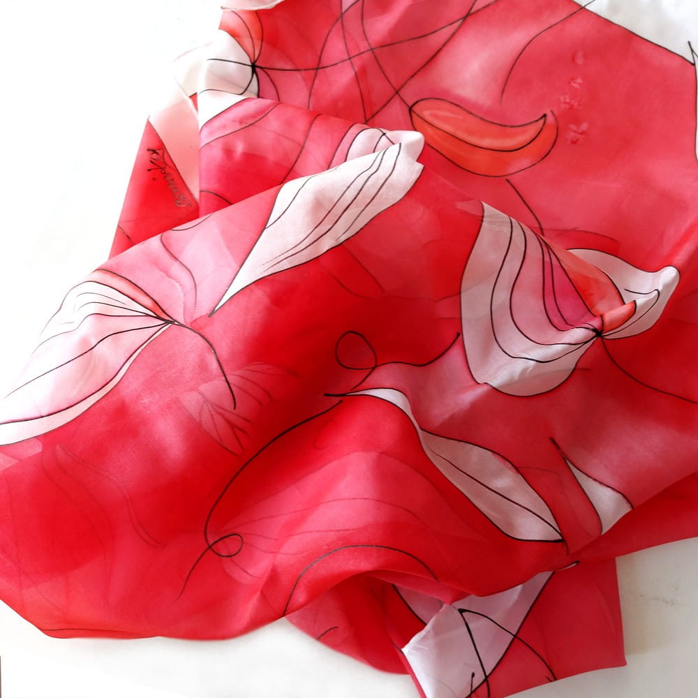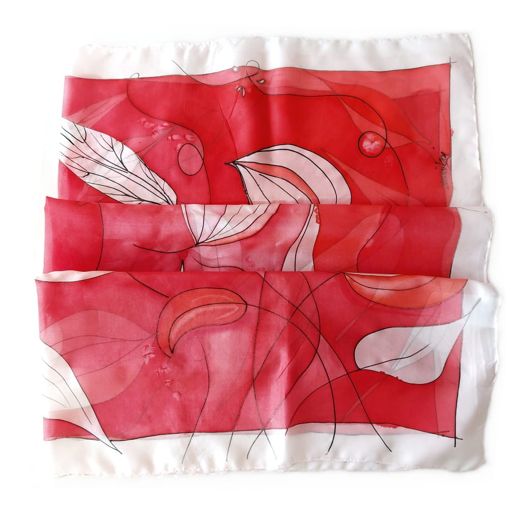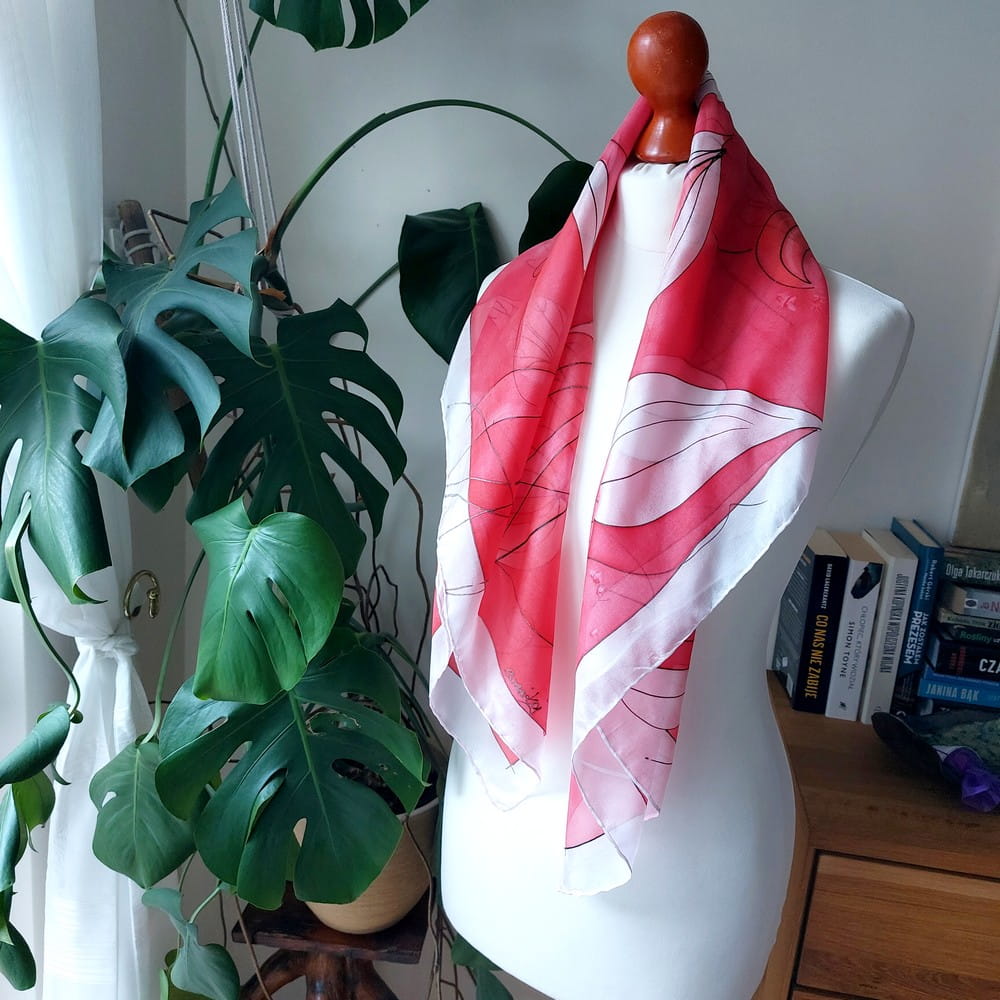 Geo liście to ręcznie malowana chusta jedwabna - autorska praca. Ręcznie malowany jedwab naturalny o intensywnych barwach w ciekawym, odcieniu czerwieni. Cudownie miękka i lejąca kwadratowa chusta, malowana ręcznie rozmiar około 90*90 cm. Delikatna zwiewna i przyjemna w noszeniu apaszka jedwabna damska . Doskonała na prezent na przykład na dzień matki czy dla przyjaciółki. Z uwagi na ręczne wykonanie - pojedynczy wzór. Sygnowana. Bogata kolorystyka. Kolory: ciemny i jasny czerwony, lekki różowy, fuksja, wiele odcieni . Tło białe, rysunek czarny.