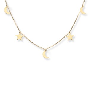 Urocza pozłacana srebrna delikatna ozdoba na szyję - łańcuszek. Celebrytka. Delikatna, ciekawa ozdoba - 5 małych delikatnych zawieszek: księżyc i gwiazdka zawieszone na stałe w środkowej części symetrycznie rozmieszczone, bez możliwości przesuwania się. Długość 40 cm + ok.4 cm przedłużki. Wielkość zawieszki około 9 i 7 mm. Srebro próba 925. Waga ok.1,6 g.