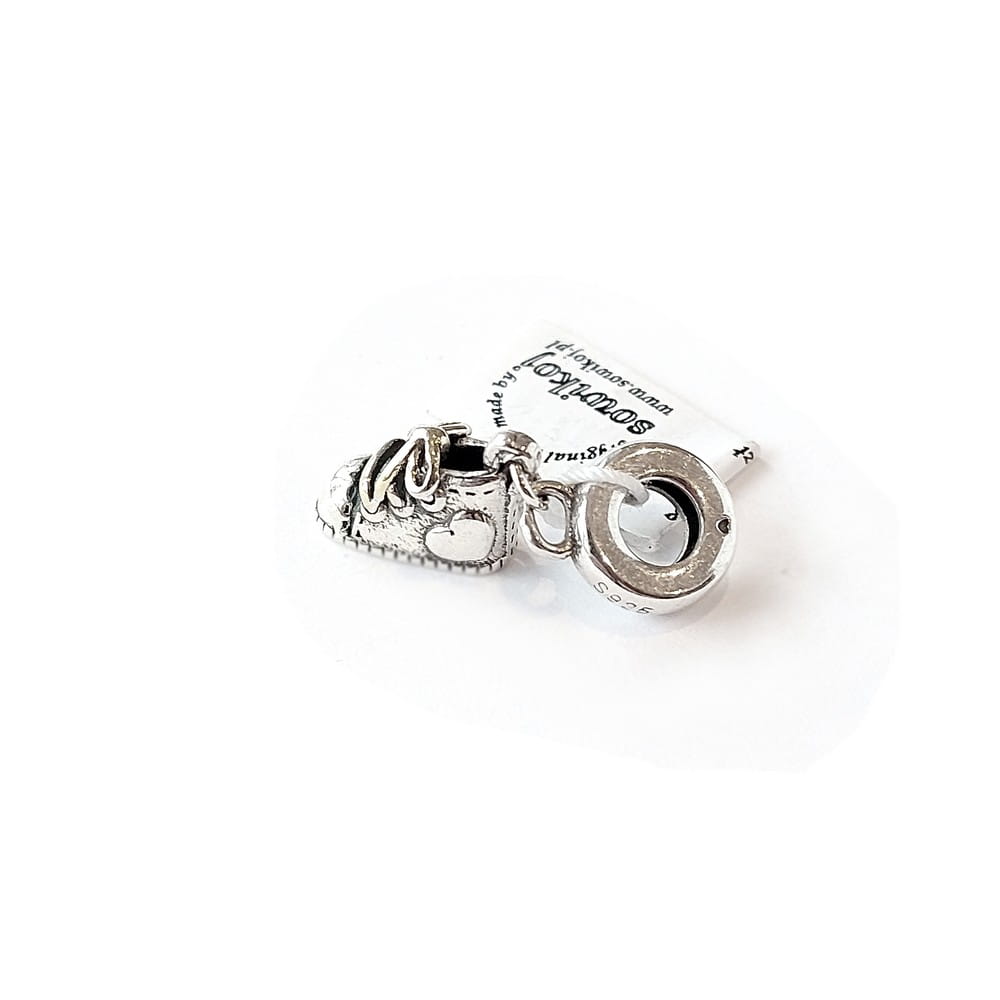 Srebrna zawieszka bucik - trampek. Zawieszka wisząca na pierścieniu - but z małym serduszkiem po boku. Zawieszka 11*8*6mm mocowana do pierścienia. Wąski gładki pierścień mocujący na bransoletce. Charms zawieszka - bez koloru. Koralik do łańcuszka czy bransoletki w typie Pandory. Wielkość pierścienia grubość ok.3mm, średnica 8,5mm oraz 4,3mm średnicy otworu na bazę. Długość/wysokość całkowita 24 mm. Srebro bita próba 925. Waga ok.3 g.