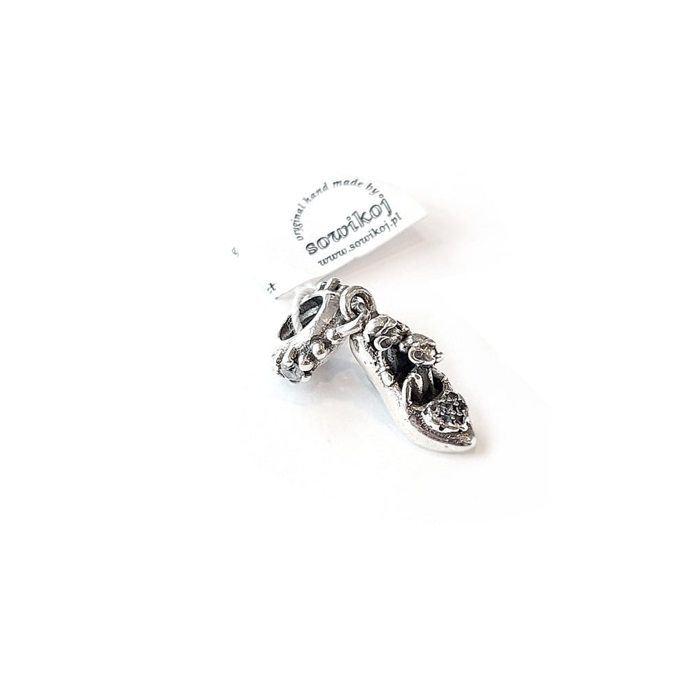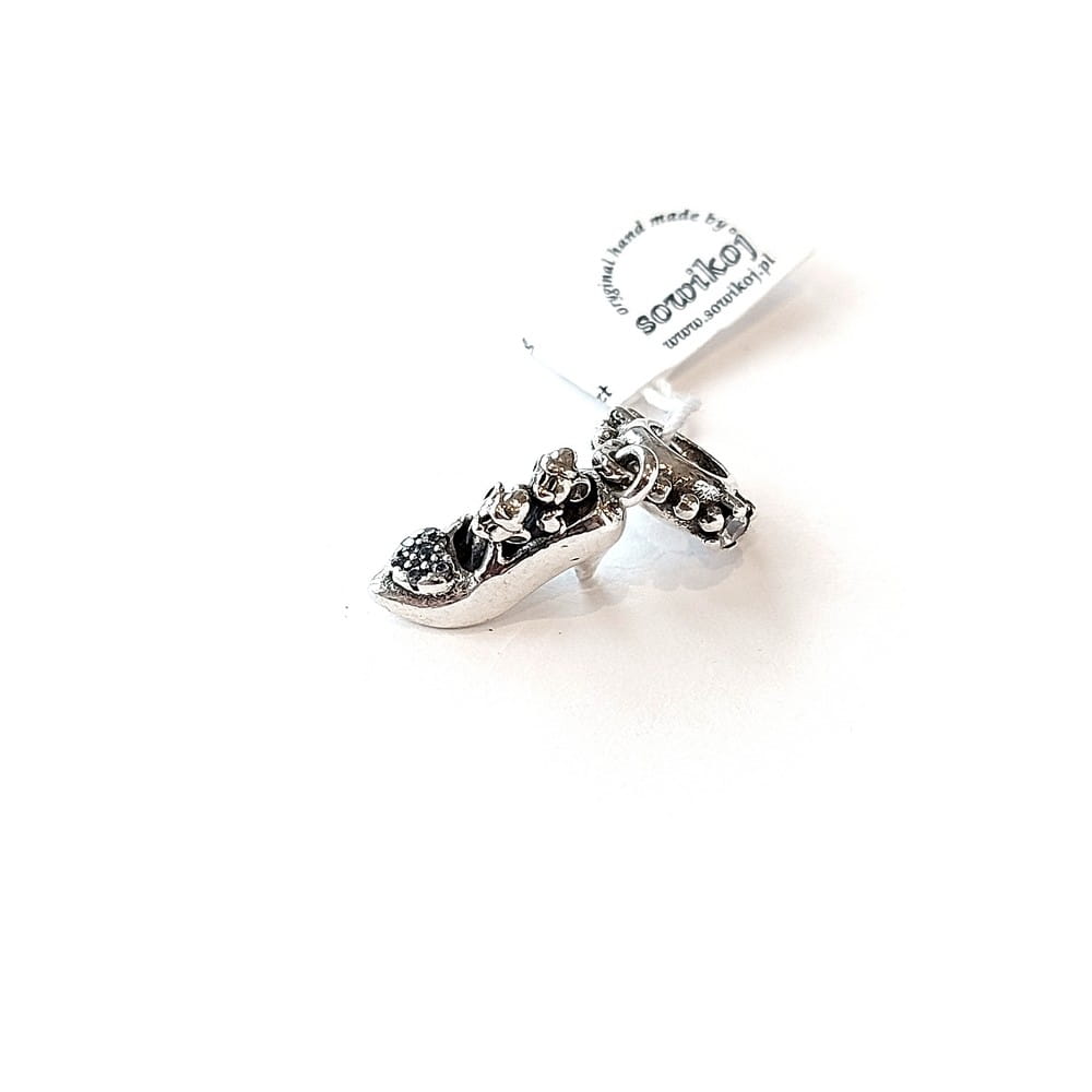 Srebrna zawieszka bucik - szpilki. Zawieszka wisząca na pierścieniu - but z niespodzianką - dwie myszy w środku szpileczki. Zawieszka 13*8*6mm mocowana do pierścienia. Wąski karbowany pierścień z 2 cyrkoniami mocujący na bransoletce. Charms zawieszka - bez koloru. Koralik do łańcuszka czy bransoletki w typie Pandory. Wielkość pierścienia grubość ok.3,5mm, średnica 9mm oraz 4,5mm średnicy otworu na bazę. Długość całkowita 26 mm. Srebro bita próba 925. Waga ok.3,1 g.