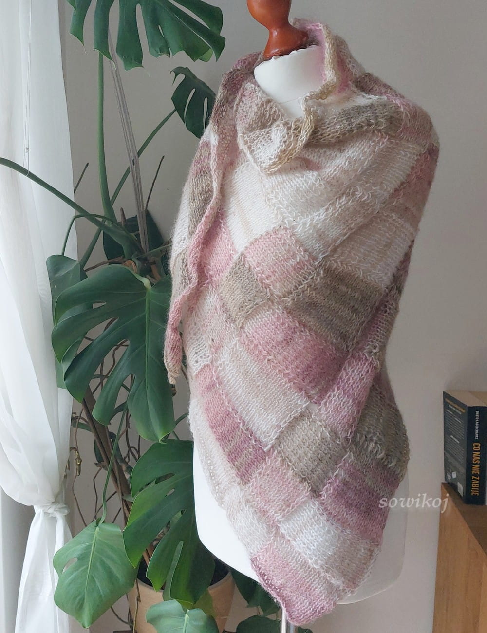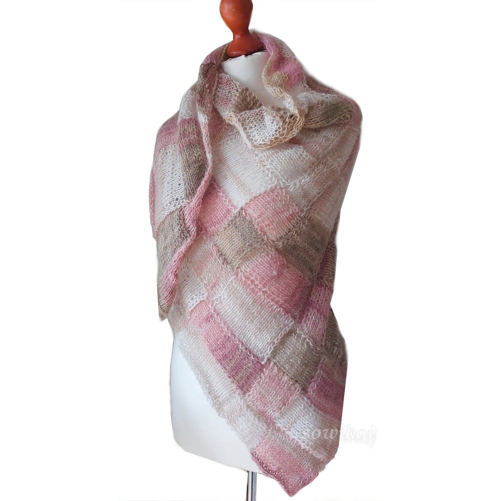 Ręcznie wykonana na drutach chusta z bardzo miękkiej włóczki (akryl 50% wełna moher 50%) w kolorze pudrowo różowym oraz lekkich akcentów brązów i beży. Lekki przestrzenny splot kwadracików i prostokątów. Bardzo miękka, ciepła, przyjemna w dotyku, oraz puszysta, a przy tym zwiewna. Doskonale otuli w chłodne wieczory.