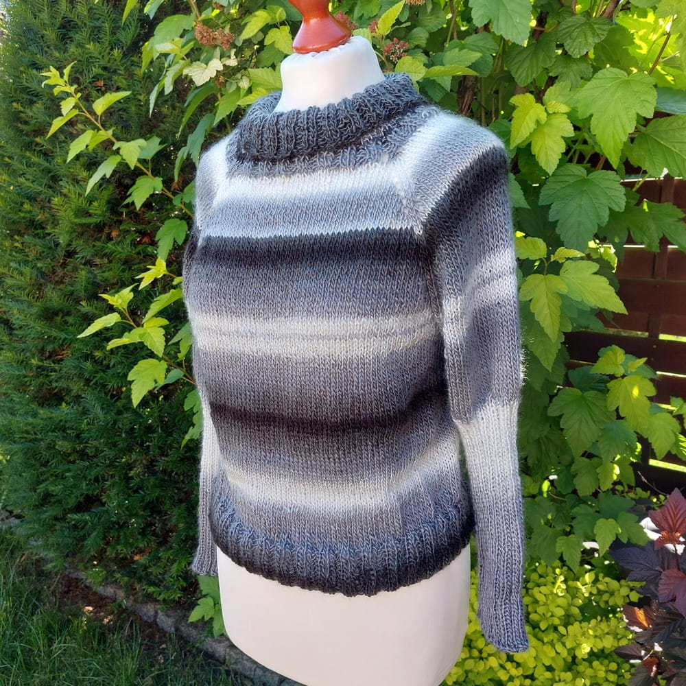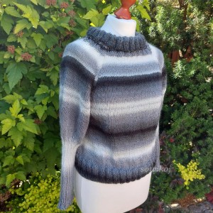 Ręcznie wykonany na drutach sweter z miękkiej włóczki mieszanki wełny z akrylem. Bardzo przyjemny w dotyku materiał. Półgolf z możliwością odwinięcia w krótki golfik. Całość w kolorze różnych odcieni szarości - od białego po czarny. Ręcznie wykonana - kolekcja autorska. Doskonale otuli w chłodne dni.