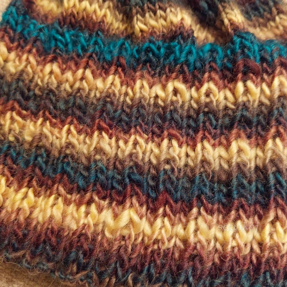 Ręcznie wykonana na drutach ciepła gruba czapka. Całość wykonana z miękkiej włóczki w mieszanych kolorach - dominujący szmaragd i bakłażanowy fiolet z beżem. Bardzo miła i przyjemna w dotyku - nie "gryzie". Ręcznie wykonana na drutach, średniej grubości splot. Doskonale otuli w chłodne dni. Ciepła i miękka, lekka. Obwód głowy - około 50-56 cm, rozciągnie się w razie potrzeby, max głębokość do zakończenia w szpic - 26 cm. Skład - wełna 30%, akryl 70 % . Prać ręcznie w letniej wodzie i w wodzie o takiej samej temperaturze płukać. Wygnieść. Lekko wykręcić. Absolutnie nie wirować! Suszyć rozłożone na płasko.
