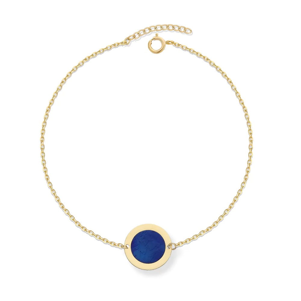 Delikatny dysk - bransoletka celebrytka z kobaltowym akcentem. Niewielki okrągły dysk z kobaltowym tytanem w środku. Średnica zawieszki ok.14mm. Awers jest bardziej matowy. Bransoletka jest dwustronna. Ciekawy akcent - spód - opalizowany termicznie tytan przegrzewany o trwałej kolorystyce głębokiego kobaltu. Całość zawieszona na delikatnym łańcuszku o długości 16 cm plus przedłużka około 3 cm. Srebro próby 925, pozłacane o wadze 0,9g. Całość 1g.