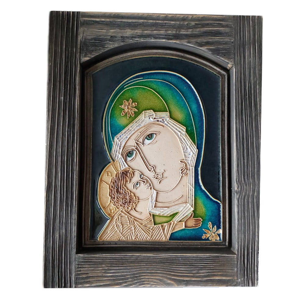 Madonna Matka Boska Włodźmierska grafit ze złoceniami. Ikona ceramiczna większa, ozdoba na ścianę w drewnianej oprawie. Piękna, ręcznie wykonana praca, szkliwiona, wypalana w piecu. W drewnianej bejcowanej na ciemny grafit oprawie. Spód podbity. Wielobarwna - każda sztuka jest nieco inna, choć zachowuje charakterystyczne wybarwienie kolorystyczne.