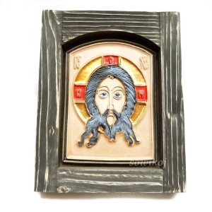 Jezus Chrystus Mandylion. Ikona ceramiczna mniejsza, ozdoba na ścianę w ramie. Piękna, ręcznie wykonana ikona ceramiczna. W całości autorska i ręcznie wykonana praca. Ceramika szkliwiona. Wielobarwna - każda sztuka jest nieco inna.