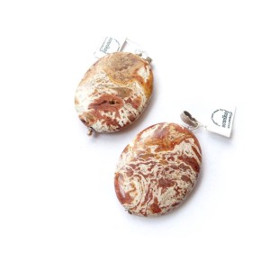 Wisior - naturalny jaspis - odmiana calsilica - zwana też: jaspis cesarski. Kamień owal wielkości 40*30 mm oraz srebrna krawatka do mocowania na łańcuszku. Kamienie gładko szlifowane w kontrastowej kolorystyce - beż i brąz. Miejscami zdarza się odcień niebiesko błękitny turkusowy lub oliwkowy. Każdy kamień ma inny, bogaty rysunek. Mocowanie i zawieszka - srebro pr.925. Całkowita długość zawieszki 56 mm. Idealny na srebrny długi łańcuszek!