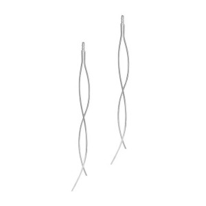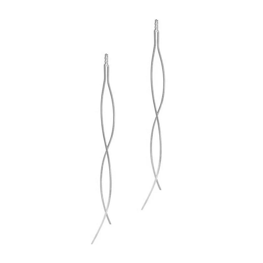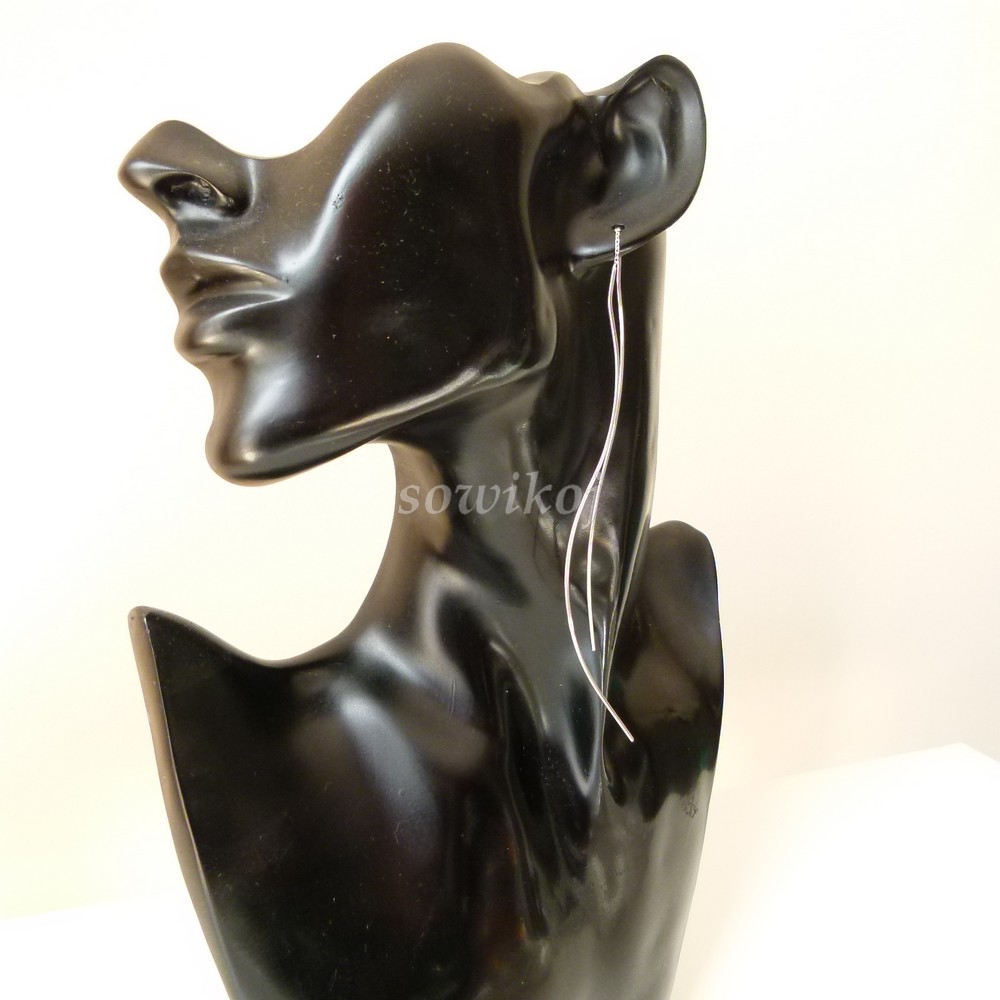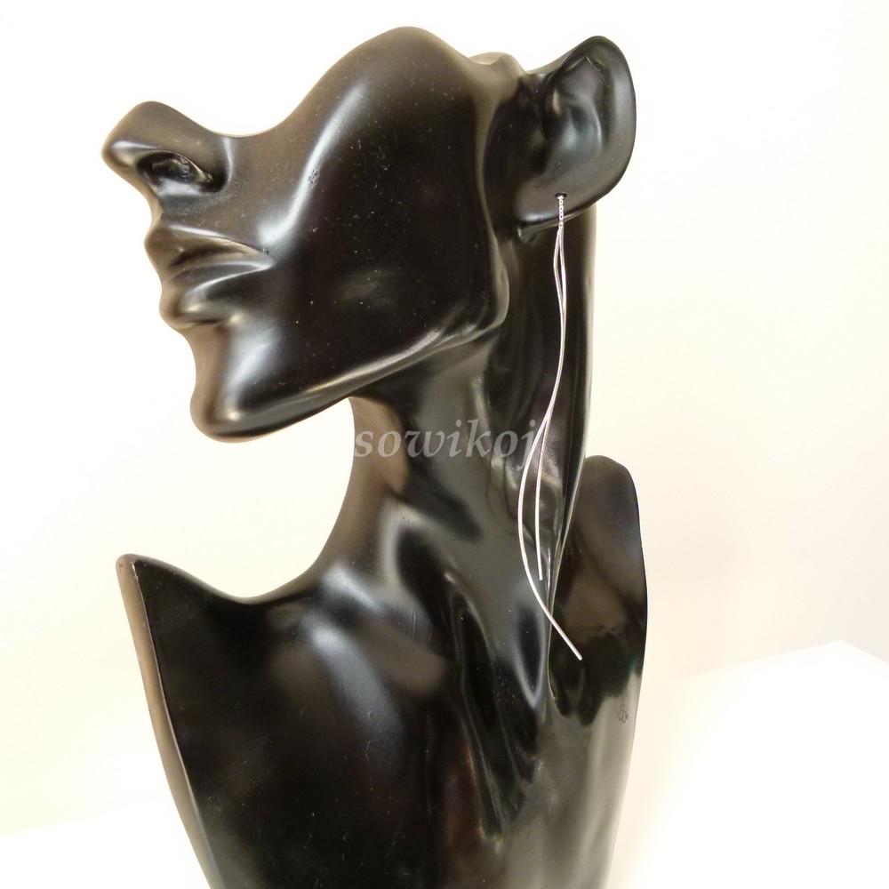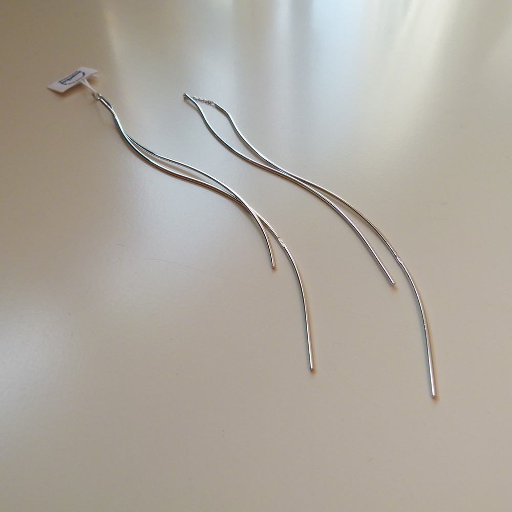 Mega długie srebrne kolczyki fale. 2 elementy przekładane przez ucho. Kolczyki srebrne rodowane. Srebro próby 925. Lekkie. mega długie - ponad 11 cm długości przy zawieszeniu jak na zdjęciu na manekinie. Zakładane jak zwykłe kolczyki i przesuwane. @ sztywne elementy są połączone krótkim łańcuszkiem. Waga srebra 3 ,8g. Wymiary pojedynczego elementu sztywnego 11,5 cm. Długość całkowita obu elementów z łańcuszkiem 23 cm, 1 mm grubości max. Dostępna jest też w wersji pozłacanej.