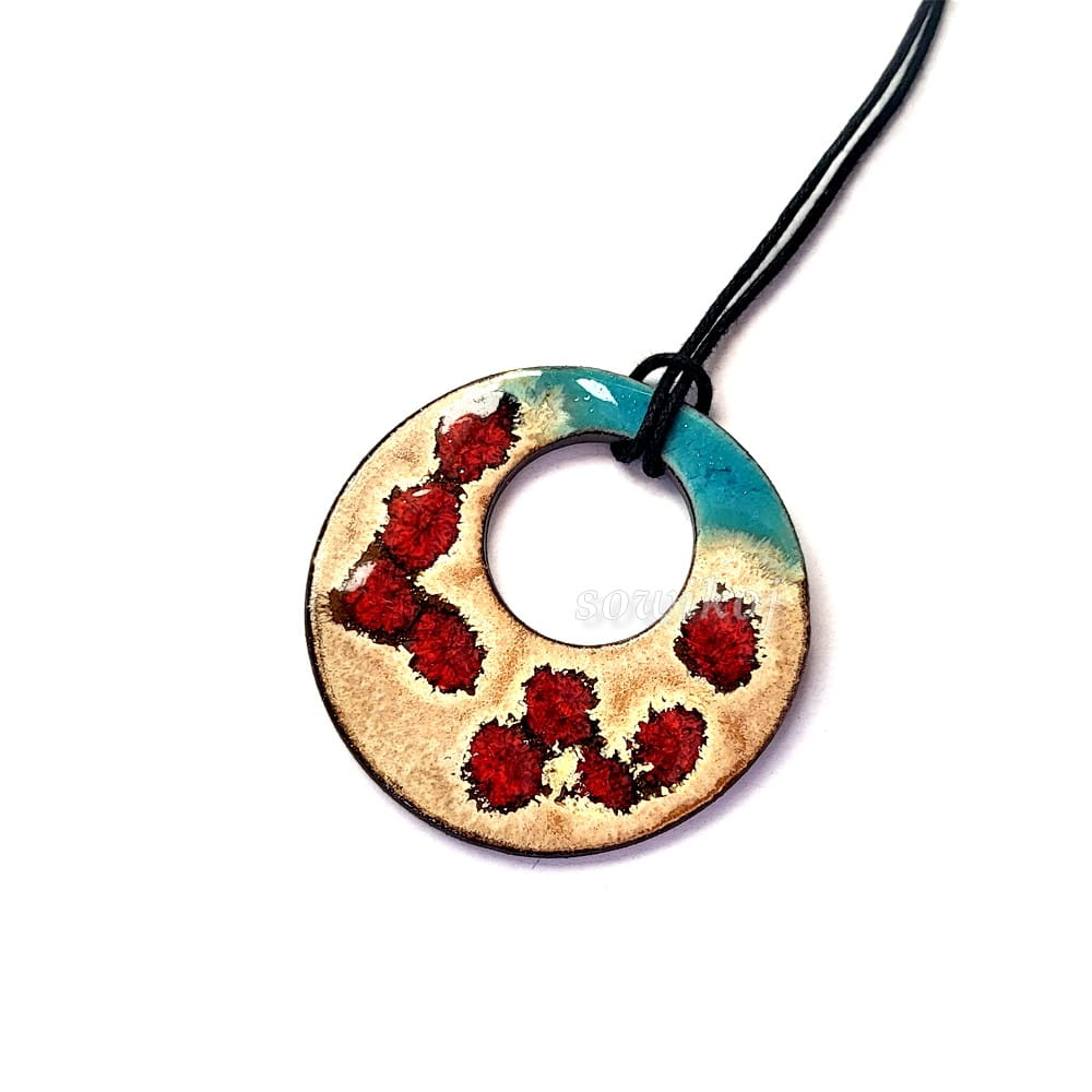 Zawieszka autorska ze wzorem przypominającym czerwone kraby na plaży. Duży okrągły wisior ceramiczny z regulowanym wiązaniem. Wielokolorowy z otworem powyżej środka. Sznurek w komplecie do regulacji długości.