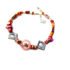 Naszyjnik - korale na szczupłą szyję. Macica perłowa bryłki czworokątne wielkości 2-16mm. Kółko jak i romby także z macicy perłowej. Zapięcie srebrne. Zróżnicowane kamienie barwionych elementów. Kółko 25mm, romby o boku 20mm. Długość naszyjnika 40 cm, waga ok.40g.