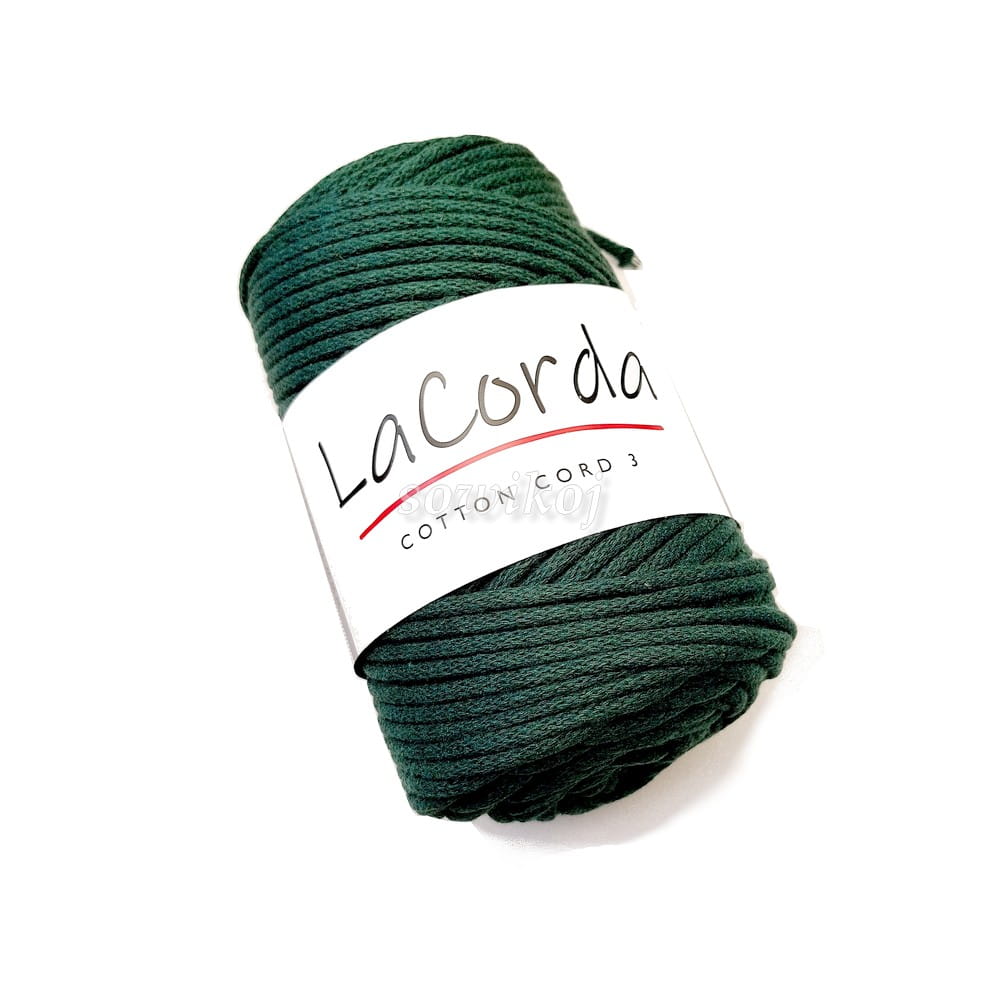 Sznurek bawełniany z rdzeniem - ciemny zielony z lurexem złotym. Kolorowy sznurek polskiego producenta LaCorda - cotton cord 3. Grubość 3-4mm z rdzeniem bawełnianym. Przeznaczony do szydełkowania lub robienia na drutach idealnie się sprawdzi do wiązania makramy. Dzięki niemu zrobisz piękne torebki, koszyki, dywany, podkładki itp. Duże motki!