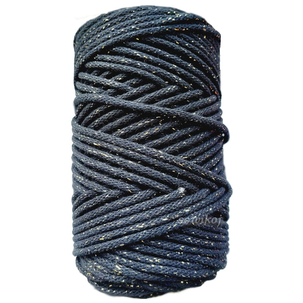 Bawełniany sznurek z rdzeniem bawełnianym, czarny ze złotym lurexem. Kolorowy sznurek polskiego producenta LaCorda - cotton cord 3. Grubość 3-4mm z rdzeniem. Gruby. Przeznaczony do szydełkowania lub robienia na drutach idealnie się sprawdzi do wiązania makramy. Dzięki niemu zrobisz piękne torebki, koszyki, dywany, podkładki itp. Duże motki!