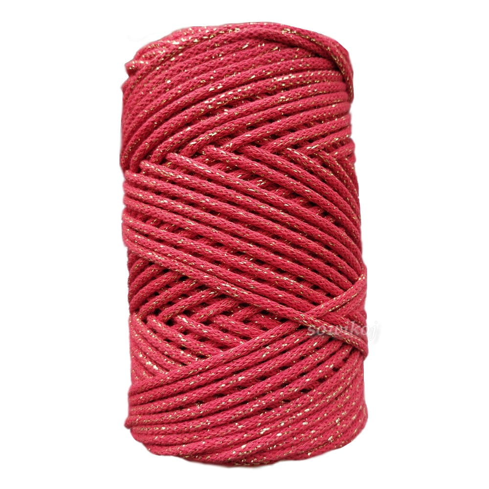 Sznurek czerwony ze złotym lurexem. Kolorowy sznurek polskiego producenta LaCorda - cotton cord 3. Grubość 3-4mm z rdzeniem. Gruby bawełniany z rdzeniem bawełnianym. Przeznaczony do szydełkowania lub robienia na drutach idealnie się sprawdzi do wiązania makramy. Dzięki niemu zrobisz piękne torebki, koszyki, dywany, podkładki itp. Duże motki!