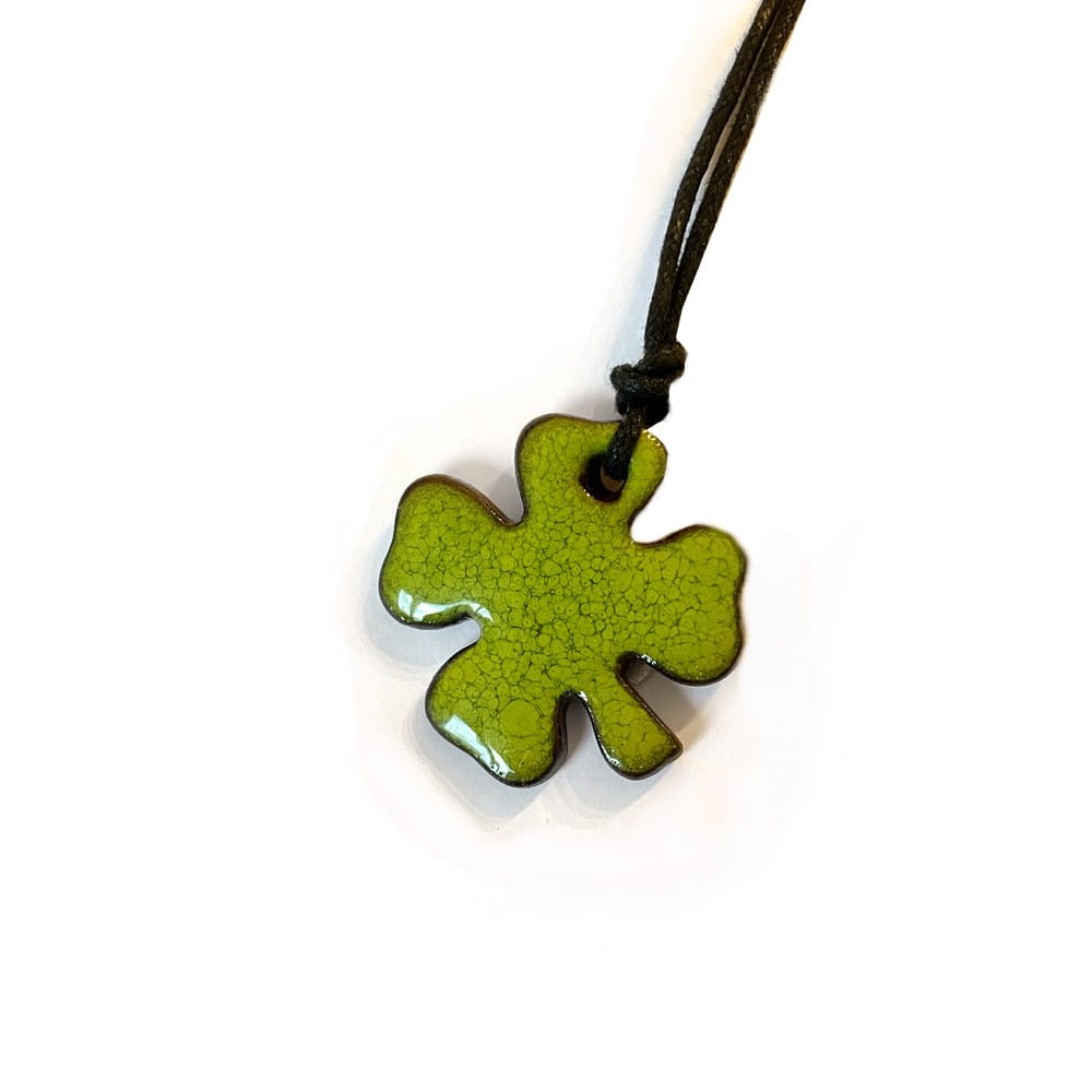 Koniczyna ceramiczna - ręcznie robiony wisior szkliwiony, dostępny wraz z uniwersalnym wiązaniem bez zapięcia do regulacji długości. W całości autorska i ręcznie wykonana praca. Ceramika szkliwiona -Spód na ciemnej glinie gładki, bez szkliwienia.