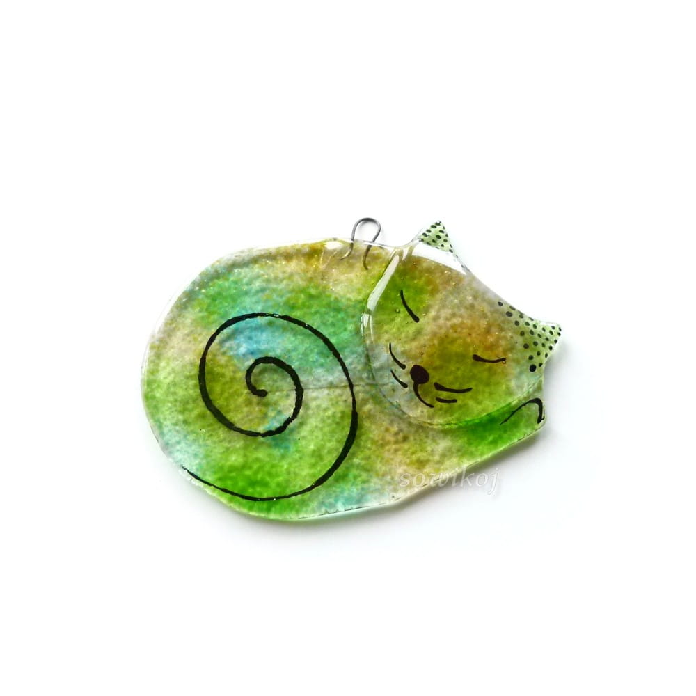 Kotek szklany na okno lub do ogrodu. W całości autorska i ręcznie wykonana praca. Zawieszka metodą topienia szkła fusing. Zawieszka - panel okienny. Koty ze szkła.