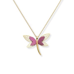 Ważka - lekki delikatny ciekawy naszyjnik srebrny - pozłacany. Zawieszka z ważką o liliowo różowych skrzydłach z przegrzewanego tytanu. Połączenie tytanu opalizowanego termicznie oraz pozłacanego srebra daje niesamowity efekt wizualny. Kolor skrzydeł zmienia się zależnie od kąta padania światła od fioletu przez róż i złoto.