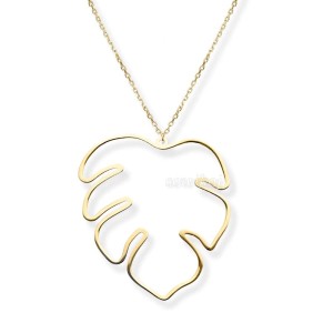 Srebrna pozłacana delikatna damska ozdoba - łańcuszek z zawieszką w kształcie liścia monstery. Zawieszka liść ażurowy (tylko obrys) większa. Delikatna, ciekawa ozdoba.