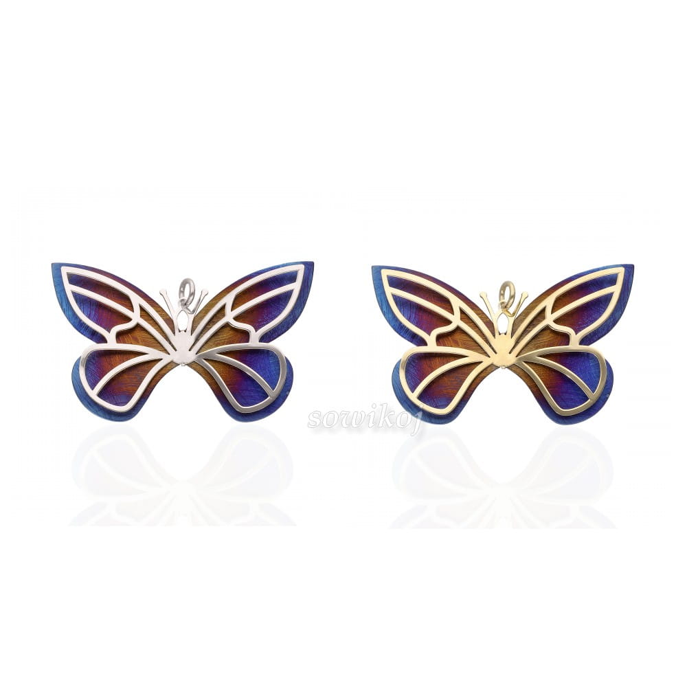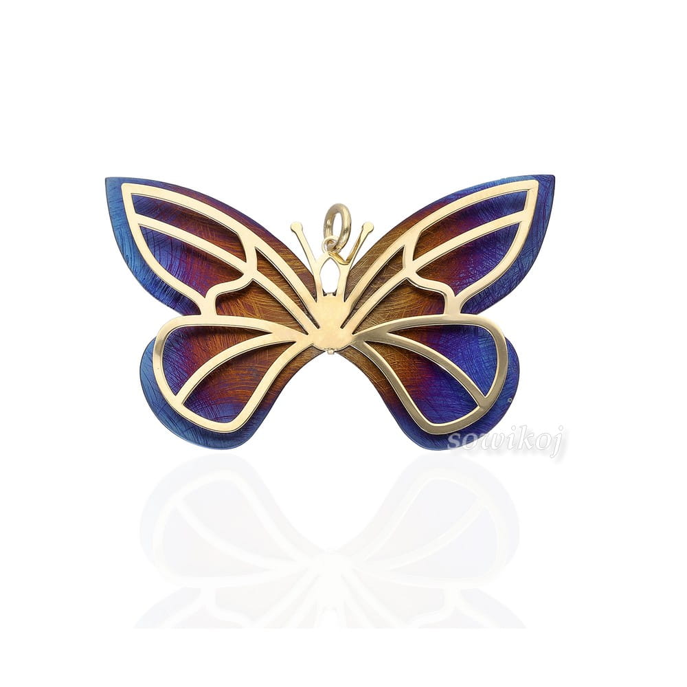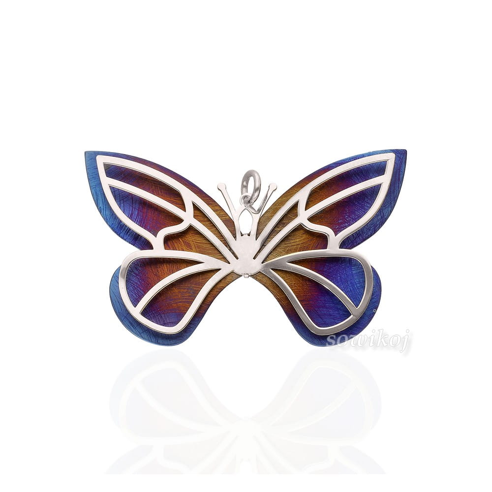 Motyl tęczowy tytanowy wisiorek. Ozdobna zawieszka do łańcuszka motyl tytanowy ze złotymi lub srebrnymi akcentami. Srebro rodowane lub pozłacane i tęczowo mieniący się tytan - interesujące połączenie z kontrastowymi opracowaniami srebra.