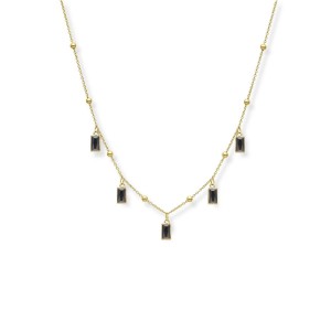Naszyjnik z pozłacanego srebra z 5 prostokątnymi małymi delikatnymi zawieszkami - cyrkonie w kolorze czarny, ładnie mieni się zależnie od światła. Wiszące w dekolcie zawieszki z cyrkoniami. Pojedynczy element ozdobny z cyrkoniami ma 5*3mm. Srebro próby 925. Waga srebra 2g, waga całkowita 2,2g. Awangardowe nowoczesne wzornictwo.