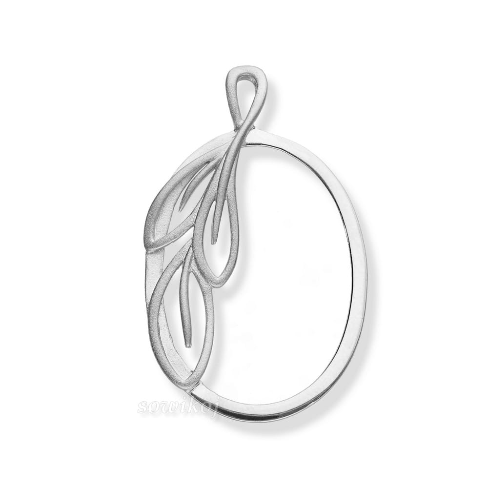 Piękny duży wisiorek w kształcie owalu z liśćmi po boku. Rodowane srebro próby 925. Dodatkowo satynowane i diamentowane w miejscu liści. Owal zewnętrzny gładki. Sztywna podwieszka do łańcuszka. Wisiorek będzie ładnie wyglądać zawieszony na dłuższym łańcuszku. Wymiary zewnętrzne 47*26mm. Waga srebra 3,6g.