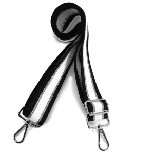 Dostępne są w różnych wariantach kolorystycznych. Tu wzór szerokie pasy glamour w kolorach: czarny, srebrny (mieniący się), biały mleczny. Kolor dwustronny. Karabińczyk i przelotki w kolorze srebrnym.