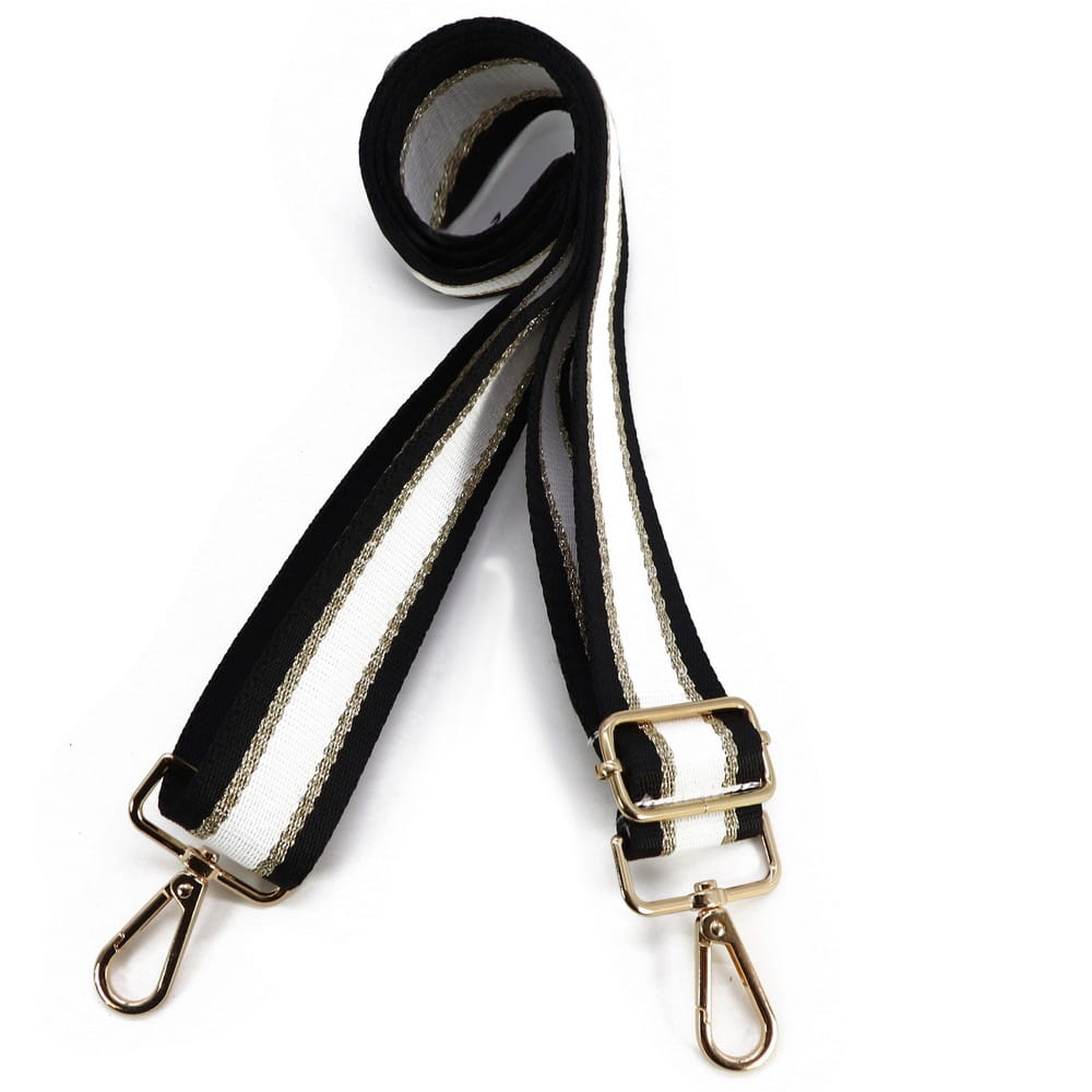 Dostępne są w różnych wariantach kolorystycznych. Tu wzór szerokie pasy glamour w kolorach: czarny, złoty (mieniący się), biały mleczny. Kolor dwustronny. Karabińczyk i przelotki w kolorze złotym.