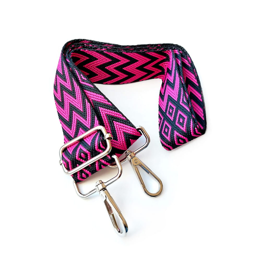 Pasek parciany różowo czarny zygzak. Romby. Uszy - rączki do torebki - uchwyt z regulacją oraz 2 karabińczyki do zapięcia.