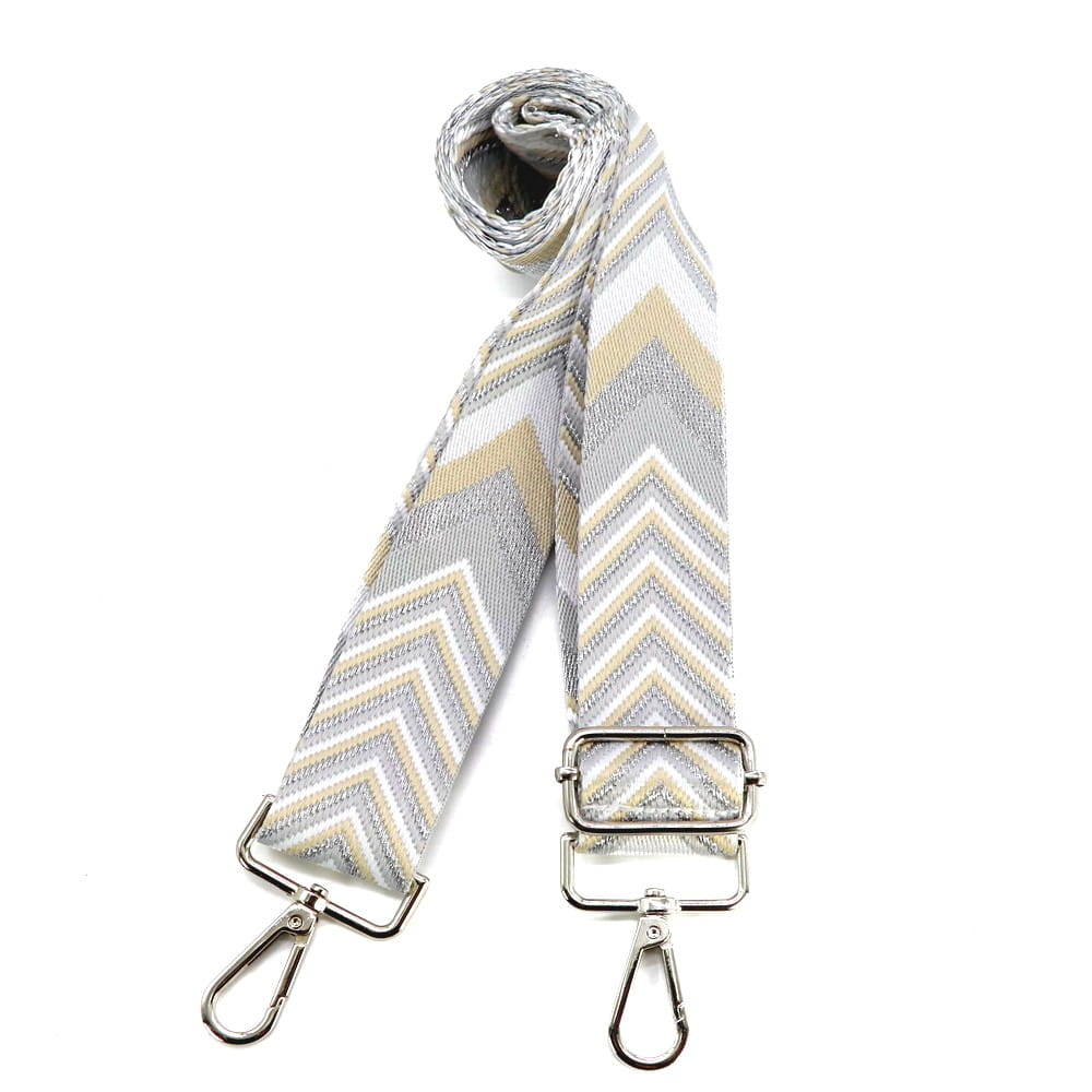 Pasek parciany beżowy, biały, brąz camel zygzak. Uszy - rączki do torebki - uchwyt z regulacją oraz 2 karabińczyki do zapięcia.