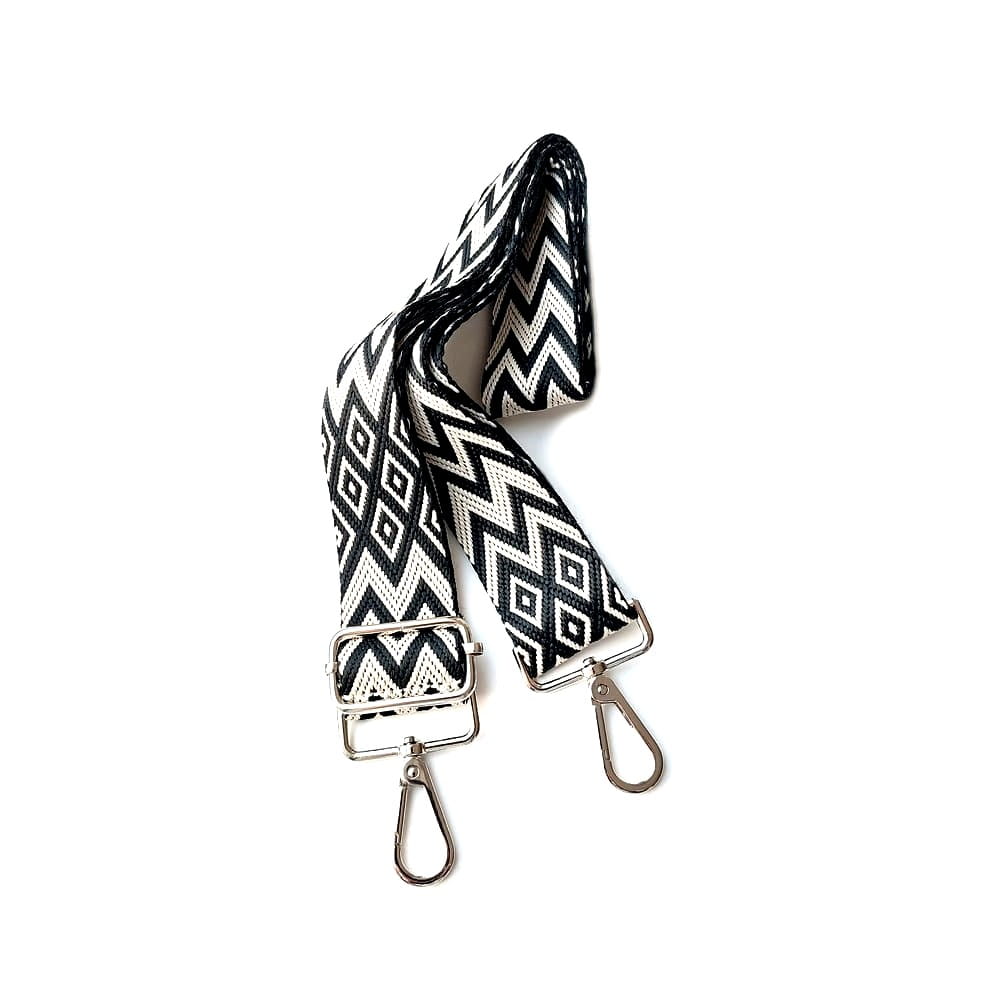 Pasek parciany biało czarny zygzak. Romby. Uszy - rączki do torebki - uchwyt z regulacją oraz 2 karabińczyki do zapięcia.
