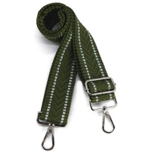 Dostępne są w różnych wariantach kolorystycznych. Tu wzór zygzak paski zielone z zielonym, lekko seledynowym błyszczącym dodatkiem glamour w kolorach: zielony oliwka. Kolor dwustronny. Karabińczyk i przelotki w kolorze srebrnym.