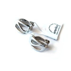 Srebrne klipsy ażurowe dwie pętle, przypominają spłaszczone Yin Yan - dwie krople - przestrzenny splot, wykonane ze srebra próby 925. Wysokość wzoru 1,3 cm. W najszerszym miejscu klipsy mają ok 10 mm. Prostokąt z plecionki pasków. Bita próba. Waga 3,2g.