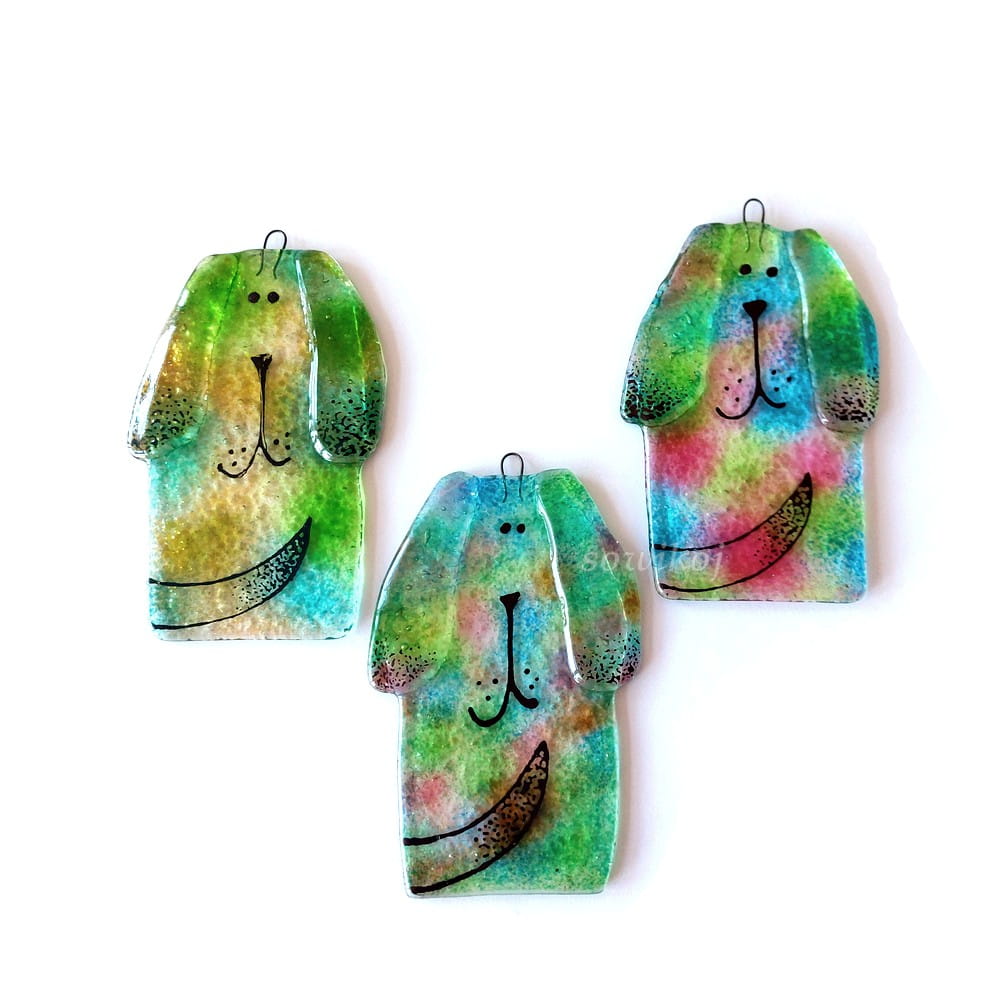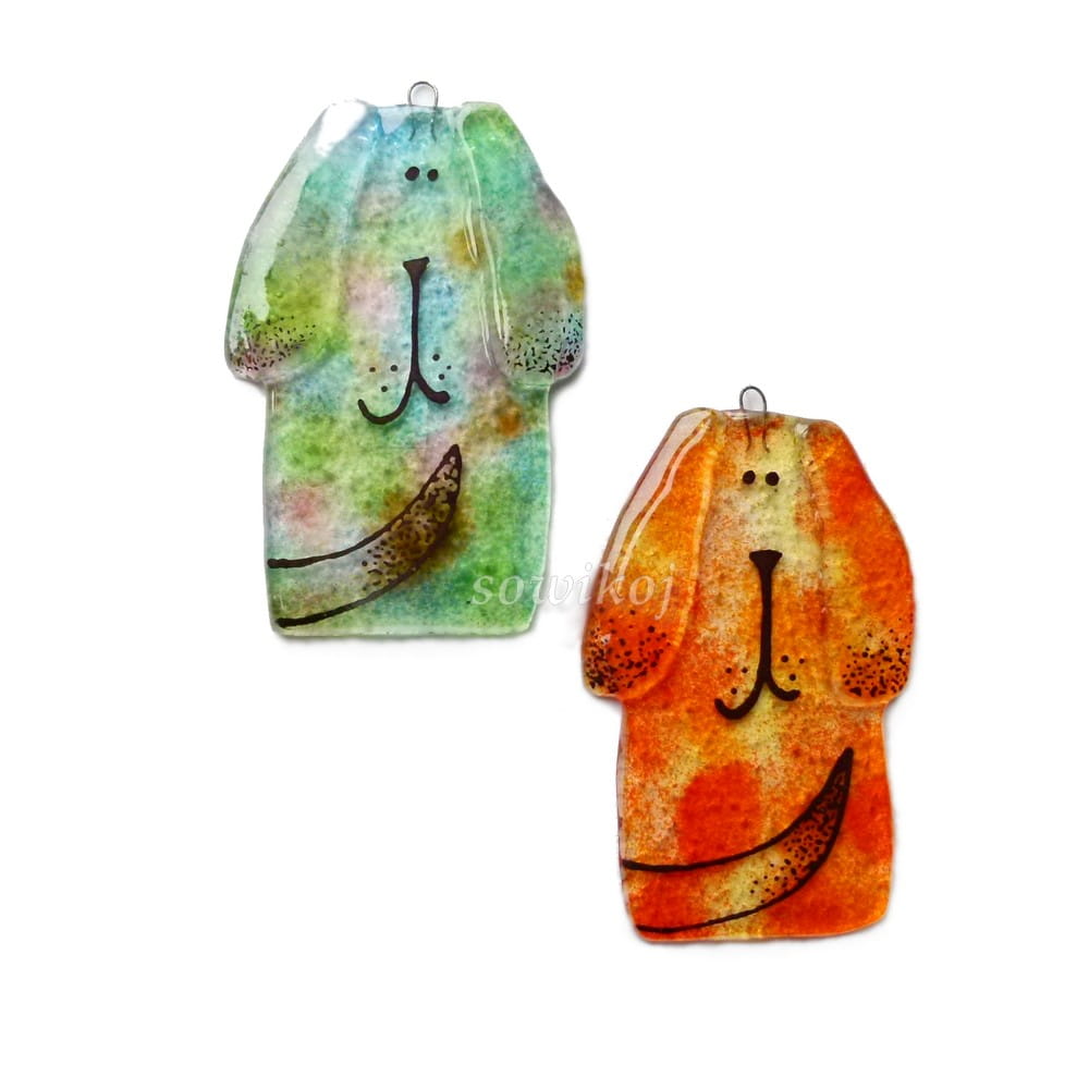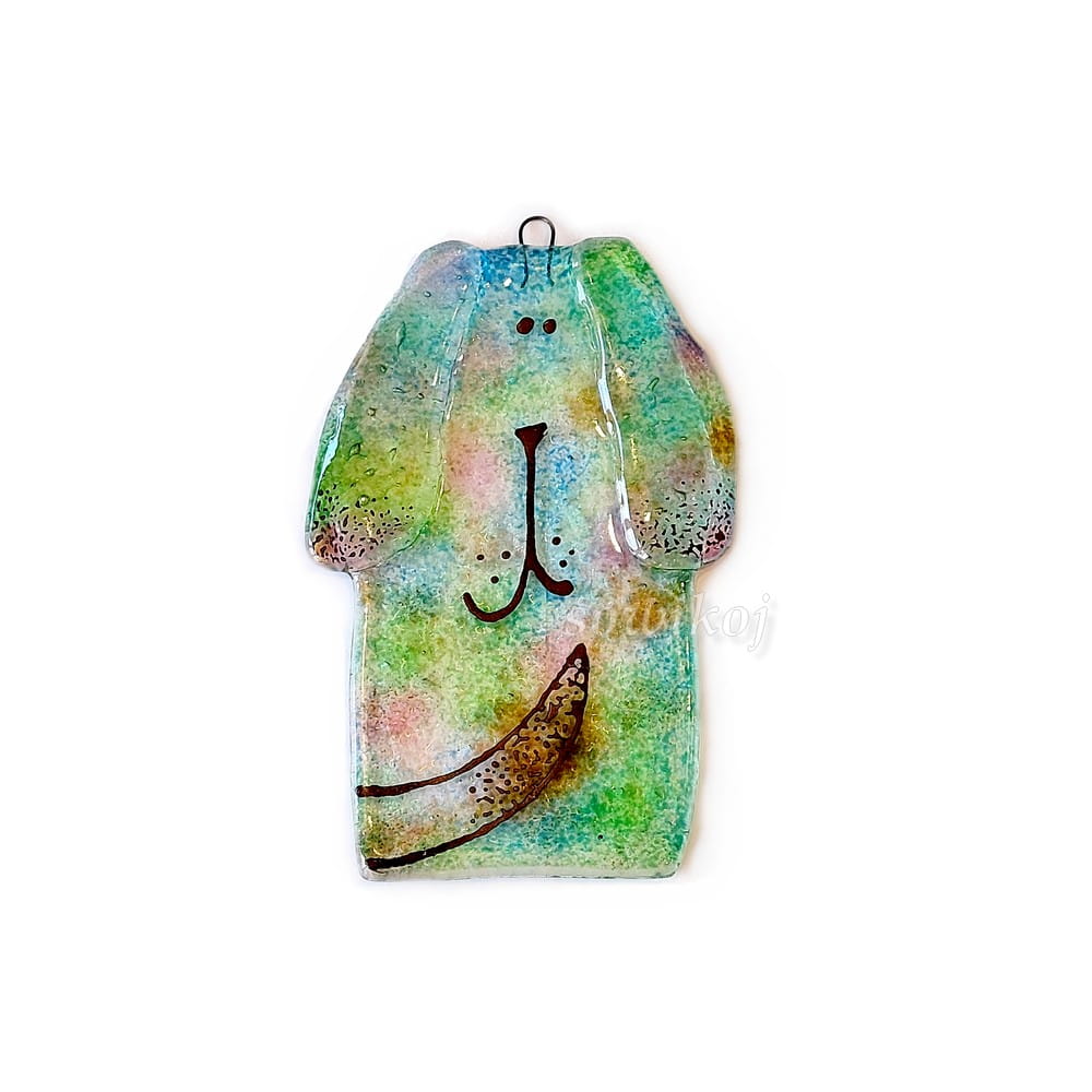 Piesek szklany - długie uszy - śmieszna kolorowa zawieszka na okno z topionego szkła. W całości autorska i ręcznie wykonana praca. Niewielka zawieszka - panel okienny.