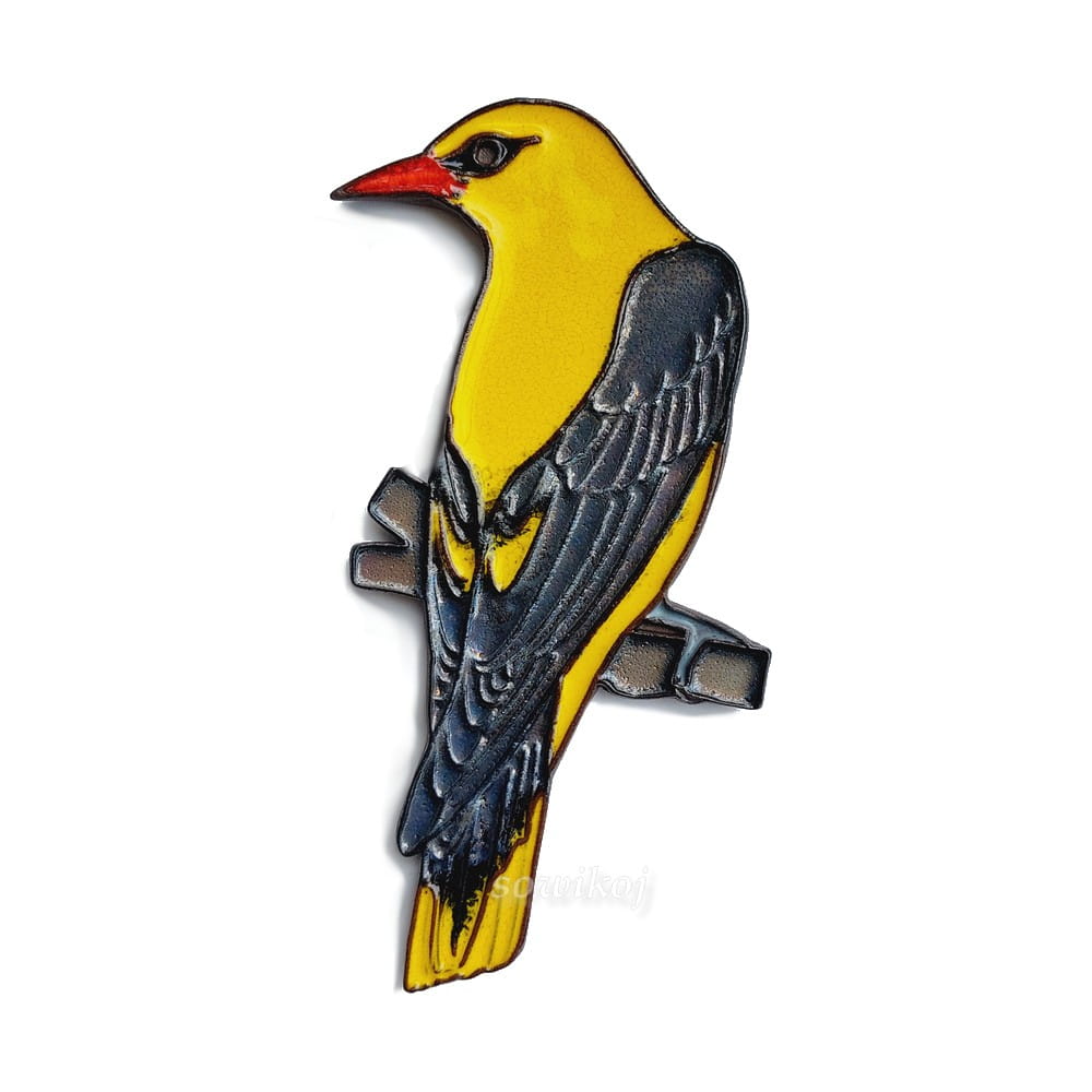 Dominujące kolory: żółty, stalowy metaliczny czarny, czerwony - dzióbek. Brązowa glina.