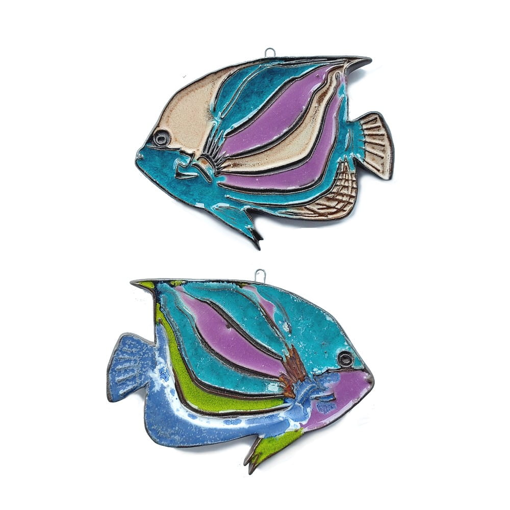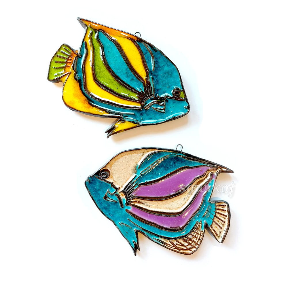 Rybka ceramiczna pielęgnica - zawieszka - obrazek do powieszenia na ścianie. W całości autorska i ręcznie wykonana praca. Ceramika szkliwiona. Wielobarwna.