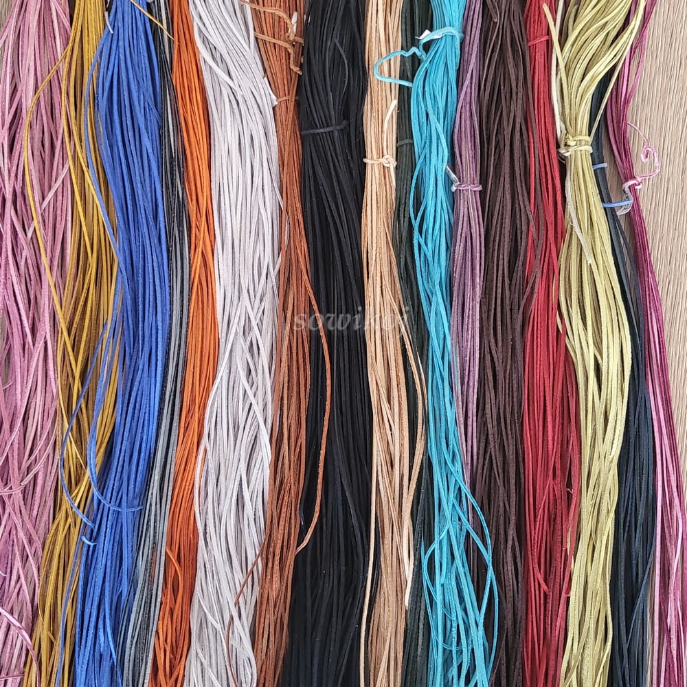 Kolory od lewej: różowy, żółty, niebieski, szary, pomarańczowy, biały, rudy, czarny, ecru, zielony (ciemna sosna), turkus, fiolet, brąz czekoladowy, czerwony, mięta, granat, fuksja, zielony jasny (trzecie zdjęcie pośrodku) . Mix kolorów to rzemienie w kolorze naturalnym z bokiem żółto cytrynowym.