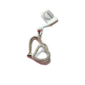 Srebrny wisiorek dwa serca ażurowe - zawieszka podwójne ukośnie zawieszone serduszko wykonane ze srebra rodowanego - próba 925. Przytulone drugie serce, wykładane cyrkoniami. Wewnętrzna mniejsza zawieszka serce z kryształkiem. Bita próba. Waga ok.2,1g. Wielkość 28*23 mm. Z uszkiem do łańcuszka - otwór na łańcuszek 4*3,5 mm.
