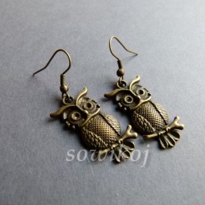 Sowy duże - kolczyki wykonane z elementów metalowych w kolorze starego mosiądzu. Symetryczne, jednostronne.