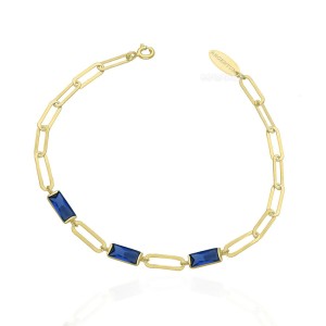 Srebrna pozłacana lub w wersji rodowanej bransoletka z prostokątnych ogniwek z trzema prostokącikami z granatowymi - niebieskimi cyrkoniami w środku. Seria prostokąciki - o niezwykle nowoczesnym wyrazie. Długość całkowita bransoletki około 19cm. Przy szczuplejszych nadgarstkach można zapiąć o wcześniejsze ogniwko (ogniwka mają około 1cm). Wielkość elementu ozdobnego z kamieniem około 10*4 mm. Srebro bita próba 925. Waga ok.2,8 g. Wariant - srebrną pozłacaną lub wersję rodowana (nie ciemnieje) należy wybrać z belki pod symbolem koszyczka.