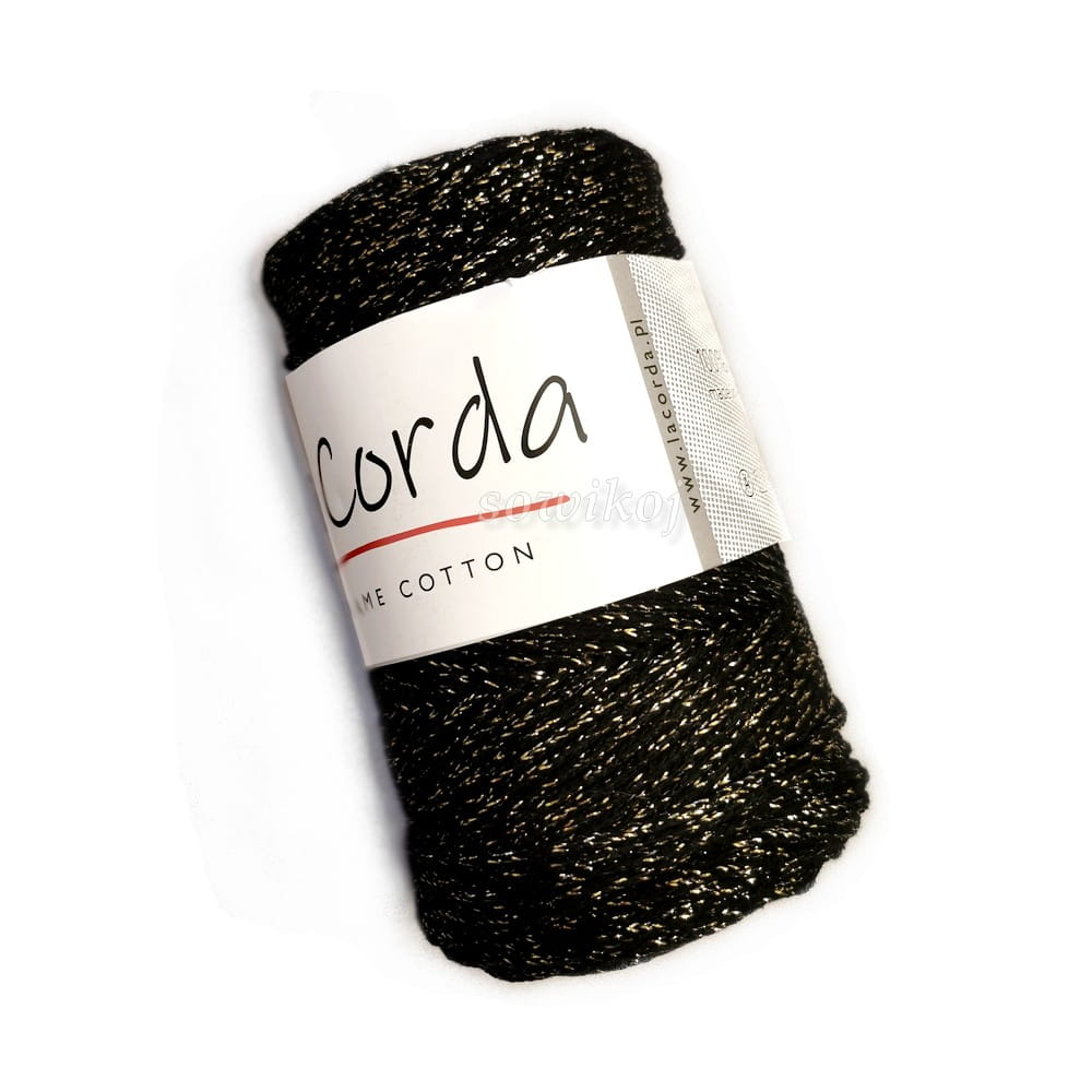 Sznurek bawełniany polskiego producenta. LaCorda macrame cotton. Grubość - około 3mm. Pleciony, bez rdzenia. Tu w kolorze czarnym z dodatkiem złotej nitki - lurex . Pleciony dzięki czemu idealnie nadaję się do szydełkowania czy na druty - w szczególności torebek, dywanów i ozdób świątecznych. Idealny do wyrobu mandali, torebek, koszyków, dywanów, podkładek itp. Duże motki 200m i 0,3 kg! Dostępne są również inne kolory. Sznurek jest miękki, sprężysty, spleciony na całej długości.