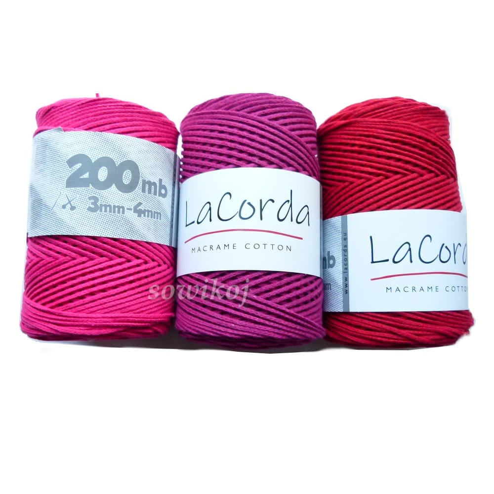 Wino - ciemno czerwony, mocny sznurek bawełniany polskiego producenta. LaCorda macrame cotton. Grubość - około 3mm. Pleciony, bez rdzenia. Pleciony dzięki czemu idealnie nadaję się do szydełkowania czy na druty - w szczególności torebek, dywanów i ozdób. Idealny do wyrobu mandali, torebek, koszyków, dywanów, podkładek itp. Duże motki 200m i 0,3 kg! Dostępne są również inne kolory. Sznurek jest miękki, sprężysty, spleciony na całej długości.