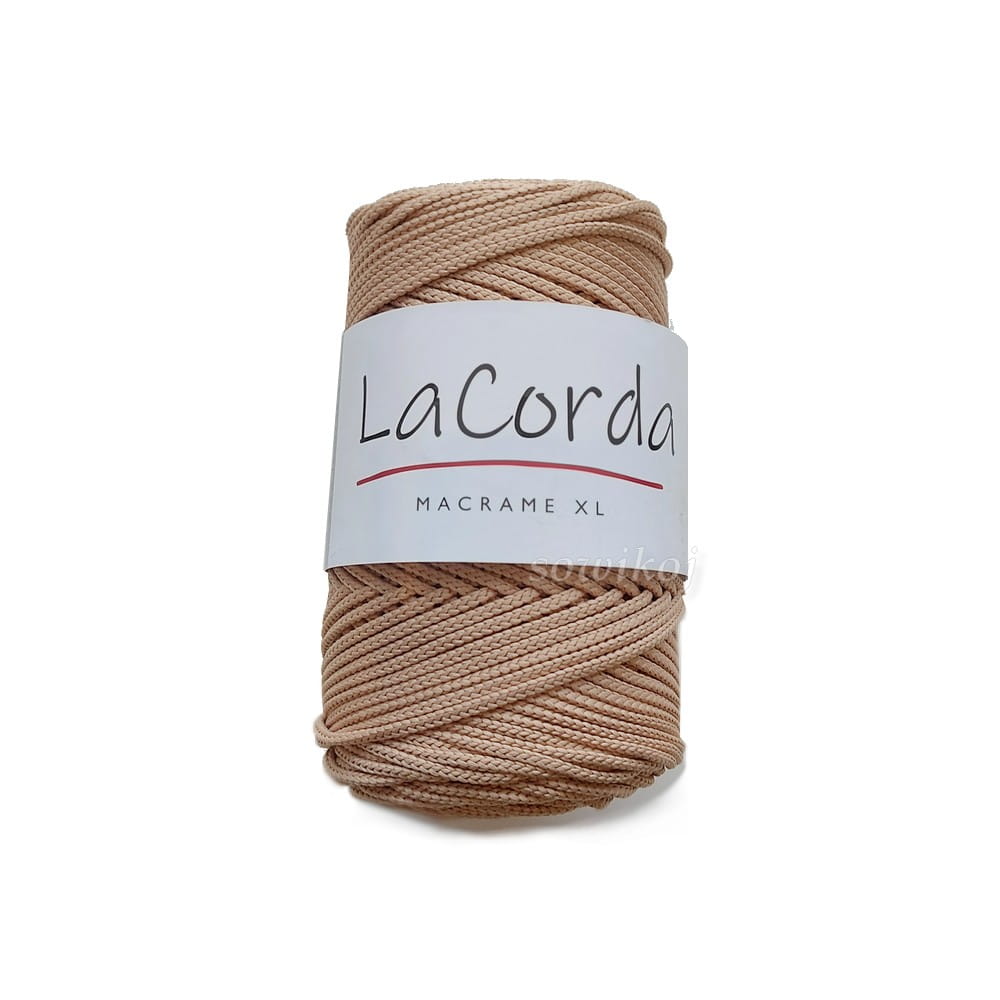 Beżowy, mocny sznurek poliestrowy polskiego producenta. LaCorda MACRAME XL w kolorze średniego beżu. Grubość - około 3mm. Pleciony, bez rdzenia. Wytrzymały i dosyć lekki. Idealnie nadaję się do wyplatania makram, szydełkowania czy na druty - w szczególności na torebki, dywany, akcesoria użytkowe dla zwierząt, jak i tworzenia ozdób. W trakcie łączenia