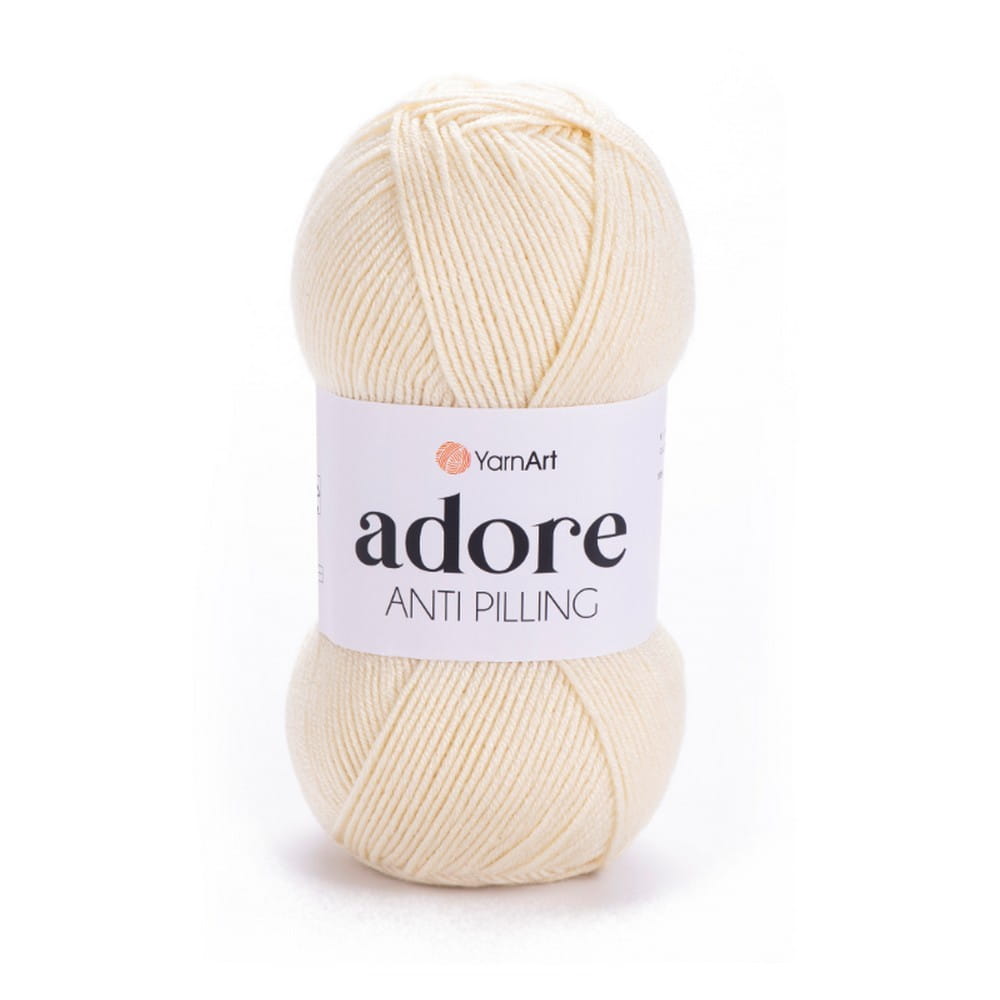 YarnArt Adore kol 331 to włóczka akrylowa anti pilling w kolorze kremowo perłowym. Włóczka skręcana, średniej grubości, lekko błyszcząca. Przeznaczona do szydełkowania lub robienia na drutach. Akryl premium anti pilling100 %. Nitki skręcone 100 g 280m.