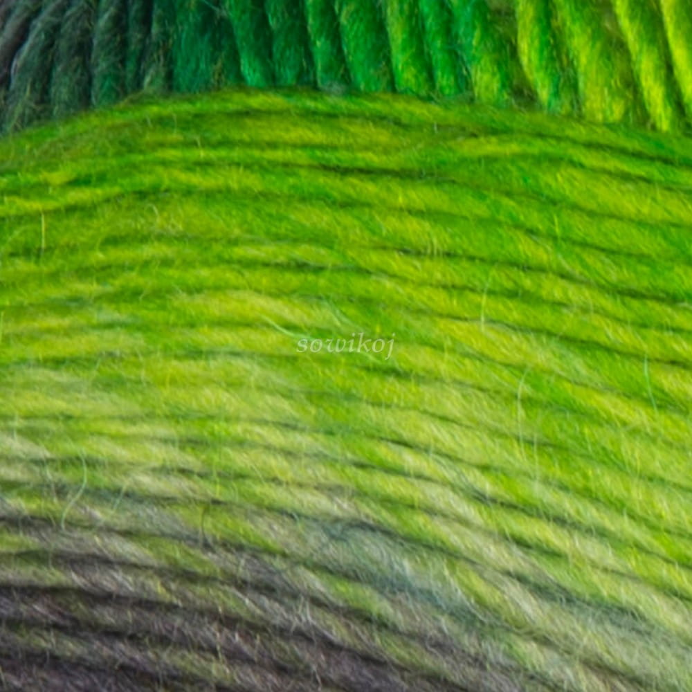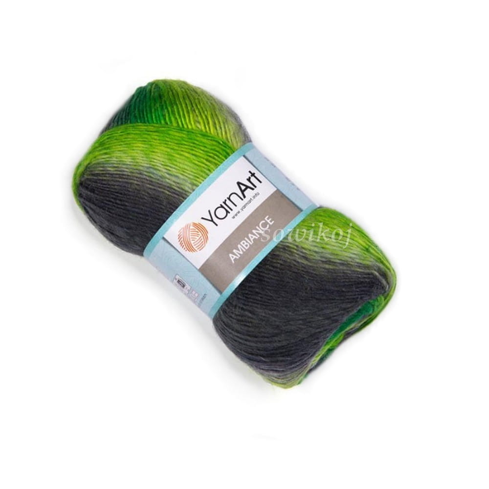 Zielony YarnArt Ambiance włóczka mieszanka wełny i akrylu - nitki skręcone, włóczka z cieniowaniem - przejściami kolorów. Przeznaczona do szydełkowania lub robienia na drutach. 100g motki. Skład: 20% wełna 80% akryl.