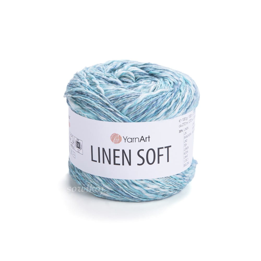 Yarn Art Linen Soft włóczka wielokolorowa dostępna w szerokiej gamie kolorów - Len i bawełna z wiskozą - tu mix kolorów turkusowych i niebieskich. Włóczka skręcana, miejscami błyszcząca, średniej grubości. Bardzo miękka i przyjemna w dotyku. Przeznaczona do szydełkowania lub robienia na drutach. Motki 100g 272m.