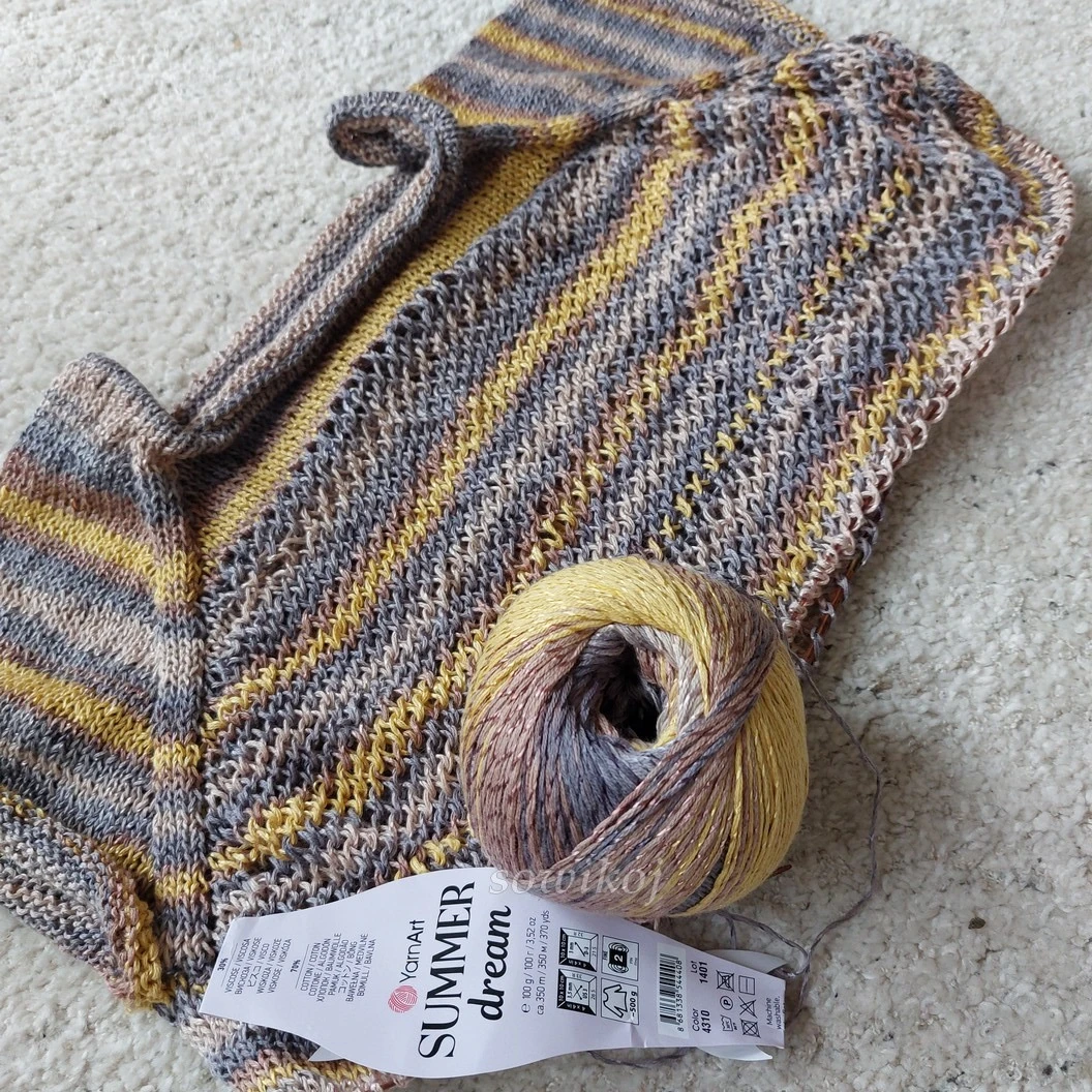 Motek - mglisty poranek. YarnArt SUMMER DREAM to miękka wydajna włóczka wielokolorowa dostępna w szerokiej gamie kolorystycznej. Mieszanka bawełny z wiskozą. 70% bawełna 30% wiskoza. Naturalna, oddychająca idealna na letnie wyroby o znacznej lekkości i przewiewności - oddychająca. Z dodatkiem pasma o większym połysku co nadaje wyrobom ciekawy desigin. Przeznaczona do szydełkowania lub robienia na drutach. Nadaje się na wyroby dla dzieci - jest miękka w dotyku. Idealnie sprawdza się do wyrobu letniej odzieży na bluzeczki, sukienki, topy i koszulki. Motki! 100 g 350 m. Nitki skręcone, sprężyste. Dostępne w szerokiej gamie kolorów.