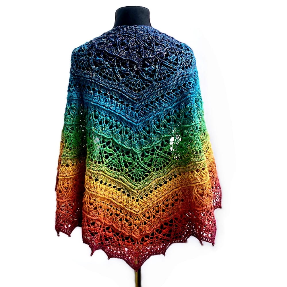Do wykonania Chusty - podobnej jak na zdjęciach ilustrujących wielkości około 150cm, potrzebny jest na kolorowy motek ombre , 3 -4 nitkowej włóczki bawełniano - akrylowej lub merino - akryl o długości około 1500m. Dla chusty o wielkości 180 cm - około 1800m. Podane wymiary uzyskano pracując szydełkiem 3 mm. Można powiększyć chustę powtarzając dowolną ilość motywów.